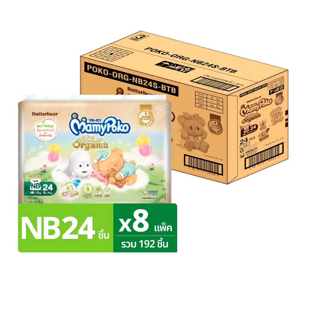 มามี่โพโค ซุปเปอร์ พรีเมี่ยม ออร์แกนิค ผ้าอ้อมแบบเทป ขนาด NB 24 ชิ้น x 8 แพ็ค