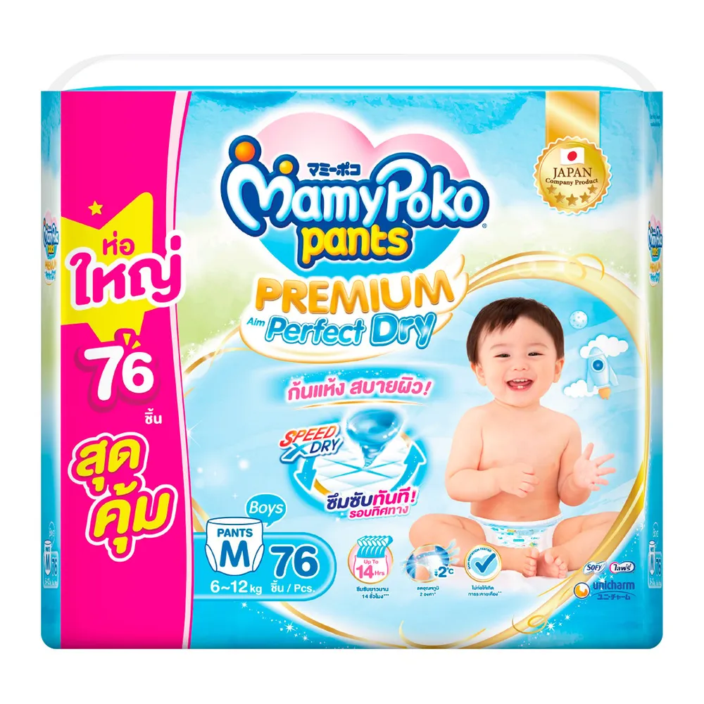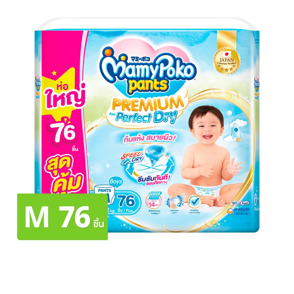 มามี่โพโค แพนท์ กางเกงผ้าอ้อม พรีเมียม เอม เพอร์เฟกต์ ดราย สำหรับเด็กชาย ขนาด M 76 ชิ้น