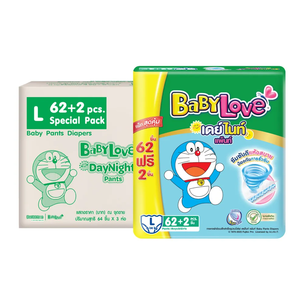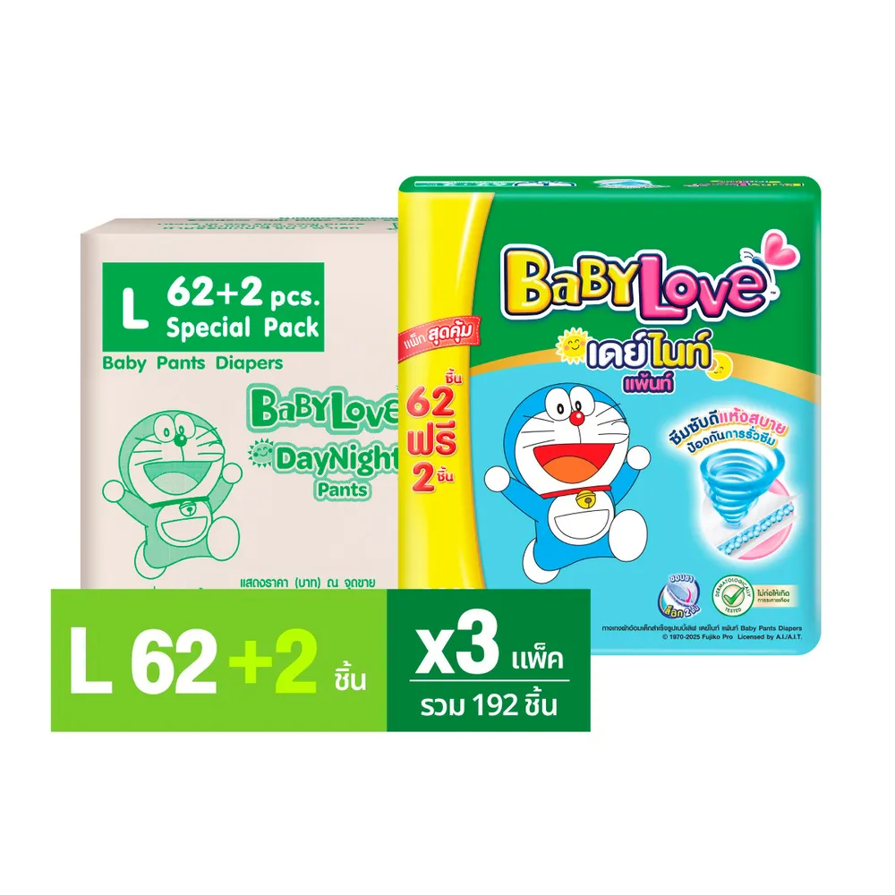 เบบี้เลิฟ เดย์ไนท์ แพ้นท์ กางเกงผ้าอ้อมเด็ก ซูเปอร์จัมโบ้ ขนาด L 62+2 ชิ้น X 3 แพ็ค
