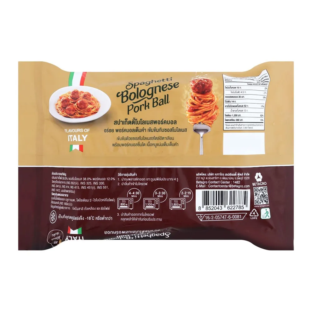 เอร็ดอร่อยไปกับ&nbsp;เบทาโกร สปาเก็ตตี้โบโลเนสพอร์คบอล ผลิตภัณฑ์อาหารพร้อมปรุงจากแบรนด์ เบทาโกร ที่ผลิตจากวัตถุดิบคุณภาพดี ผ่านกรรมวิธีการผลิตที่ได้มาตรฐาน สปาเก็ตตี้สไตล์อิตาลี อร่อย พอร์คบอลเต็มคำ เข้มข้นกับซอสโบโลเนส รับประทานง่ายเพียงอุ่นในเตาไมโครเวฟ<br />