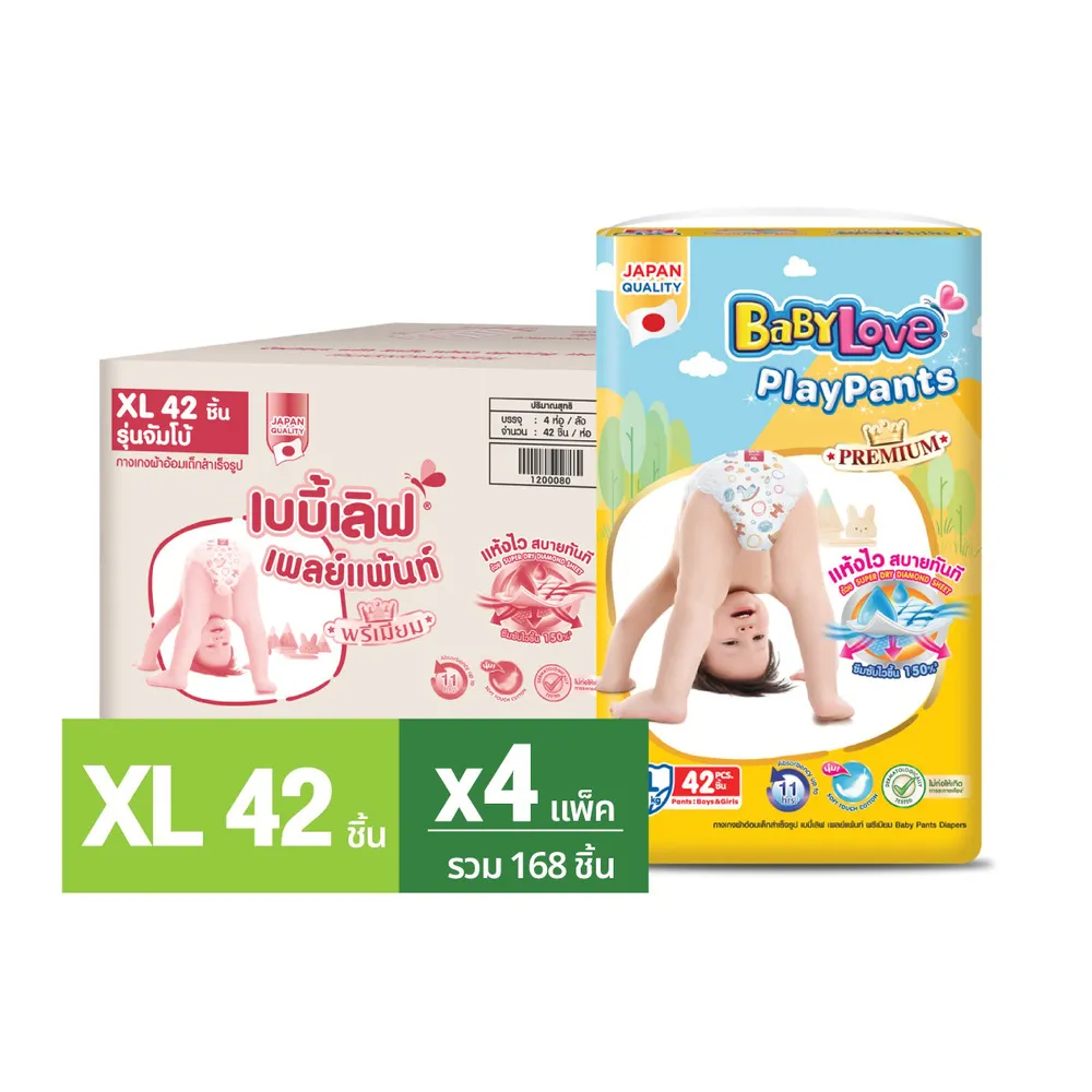 เบบี้เลิฟ เพลย์แพ้นท์ พรีเมียม กางเกงผ้าอ้อมเด็ก จัมโบ้แพ็ค ขนาด XL 42 ชิ้น X 4 แพ็ค