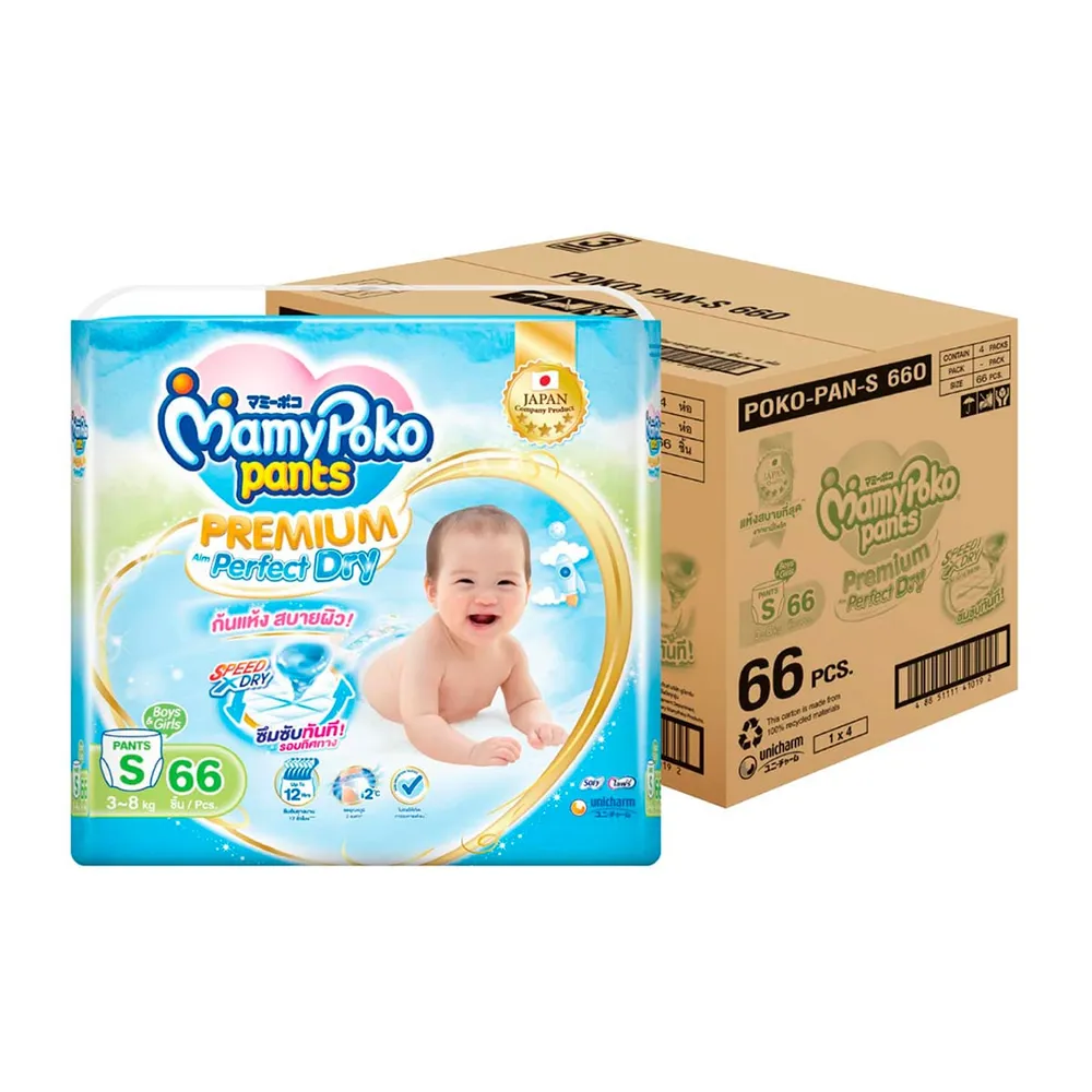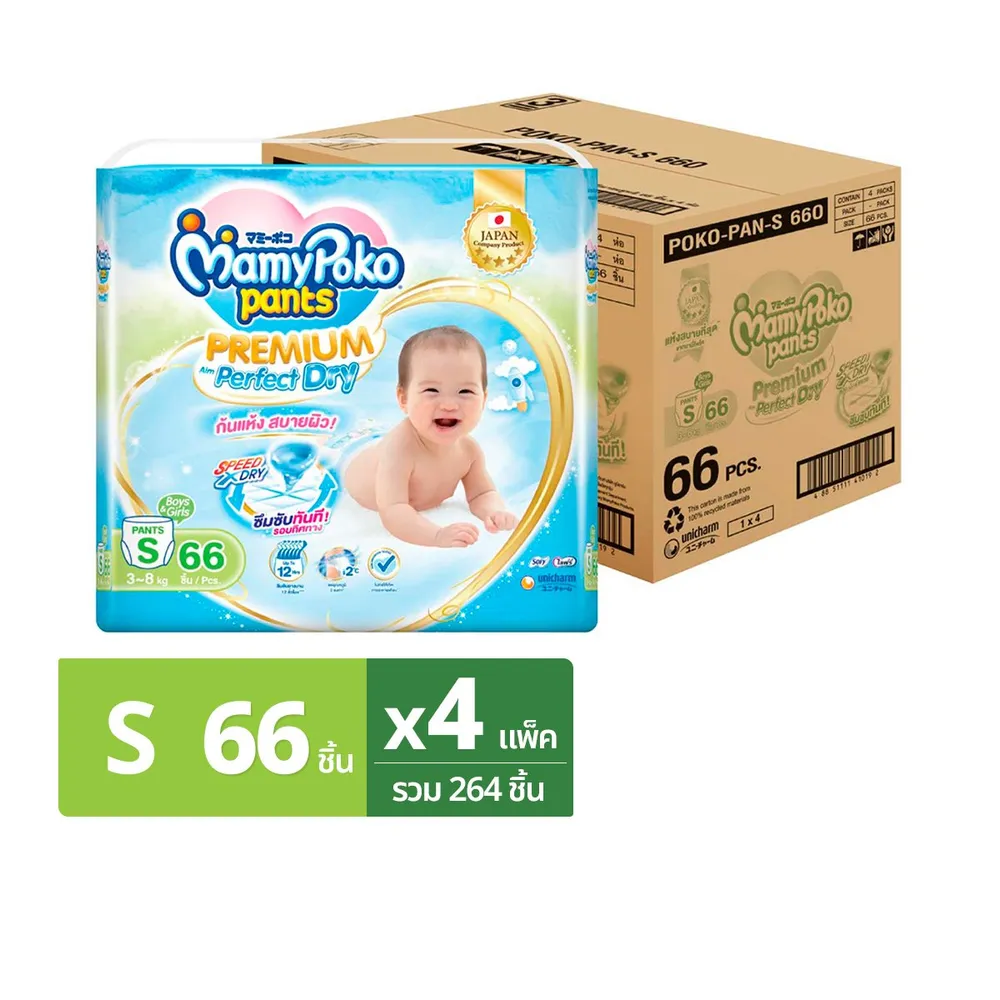 มามี่โพโค แพนท์ กางเกงผ้าอ้อม พรีเมียม เอม เพอร์เฟกต์ ดราย ขนาด S 66 ชิ้น x 4 แพ็ค