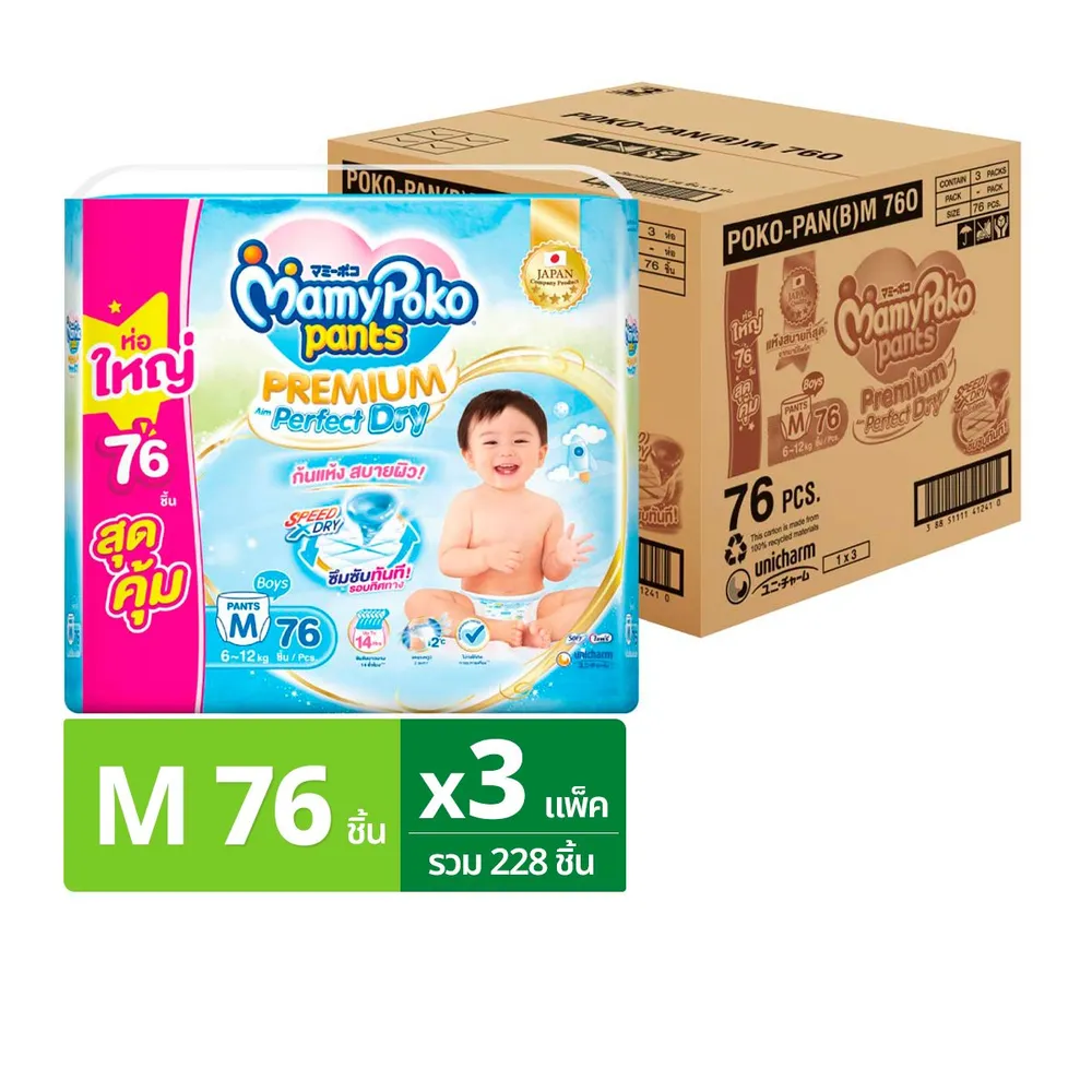 มามี่โพโค แพนท์ กางเกงผ้าอ้อม พรีเมียม เอม เพอร์เฟกต์ ดราย สำหรับเด็กผู้ชาย ขนาด M 76 ชิ้น x 3 แพ็ค