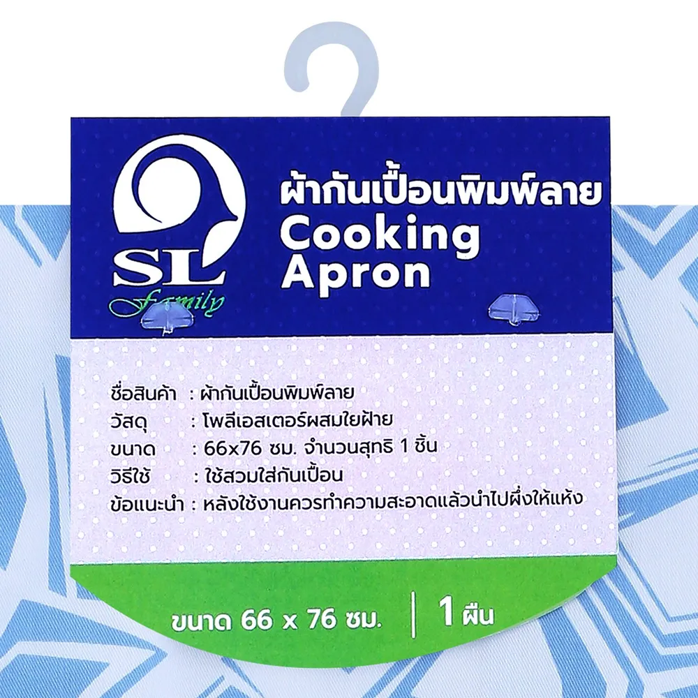 <p>เอสแอล แฟมิลี่ ผ้ากันเปื้อนพิมพ์ลาย<br /><br />"SL FAMILY" ผู้นำด้านผลิตภัณฑ์ทำความสะอาด ของใช้ในครัวเรือน และอุปกรณ์ทำความสะอาด<br /><br />- ผ้ากันเปื้อน<br />- วัสดุโพลีเอสเตอร์ผสมใยฝ้าย<br />- สำหรับใช้สวมใส่เพื่อกันอาหารเปื้อนใส่เสื้อผ้า<br /><br />*สีของสินค้าอาจมีความแตกต่าง ขึ้นอยู่กับการตั้งค่าของแต่ละหน้าจอ และภาพประกอบใช้เพื่อการโฆษณาเท่านั้น</p>