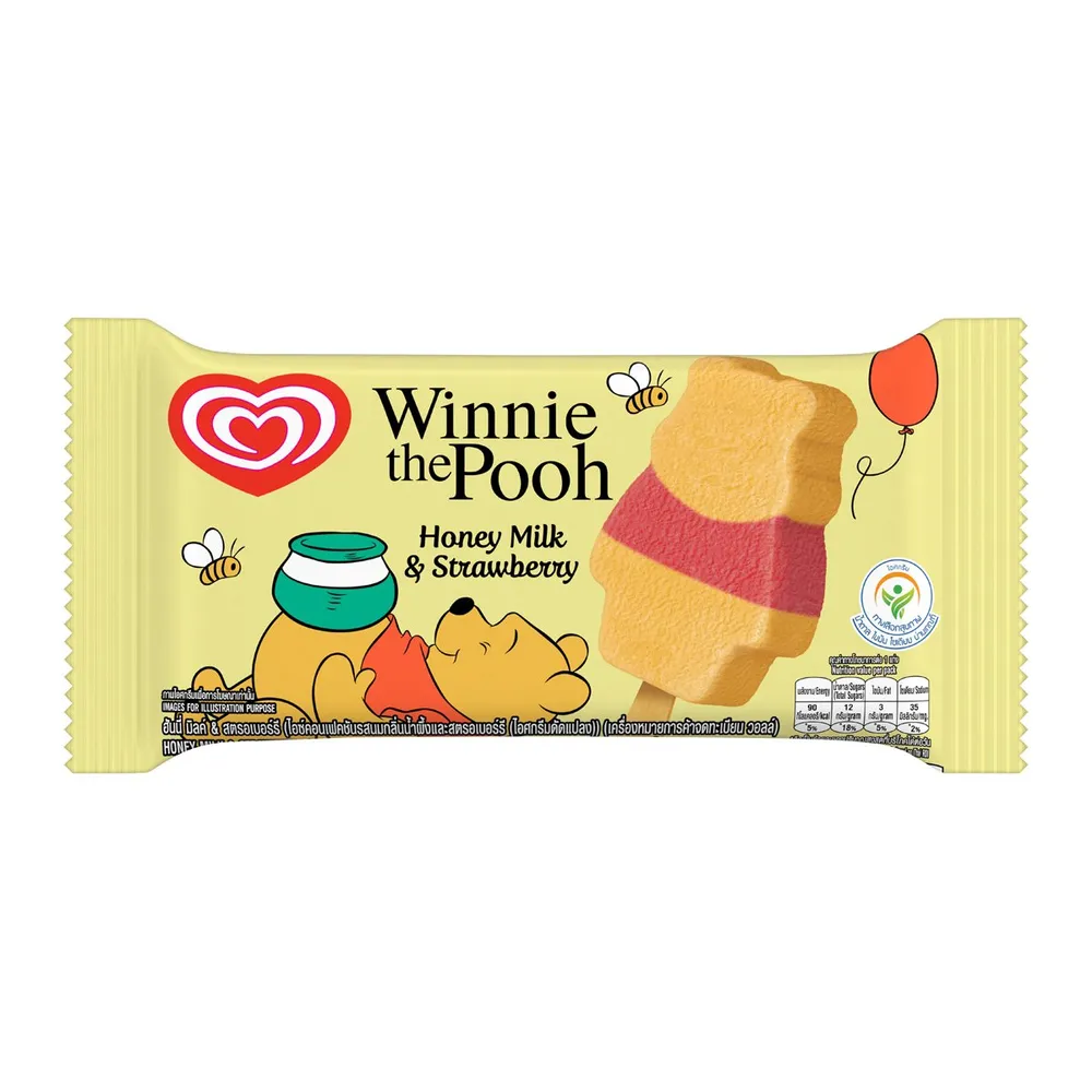 วอลล์ ไอศกรีมสุดแสนอร่อย แท่งรูปหมีวินนี่ เดอะ พูห์ สุดแสนน่ารัก หอมหวานอร่อยลงตัวด้วยไอศกรีมรสนมน้ำผึ้ง เนื้อเนียนนุ่มเพิ่มความสดชื่นด้วย รสสตรอเบอร์รี่ อร่อยลงตัวถูกใจทุกคน<br />