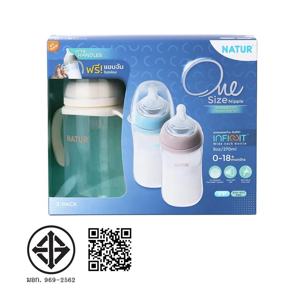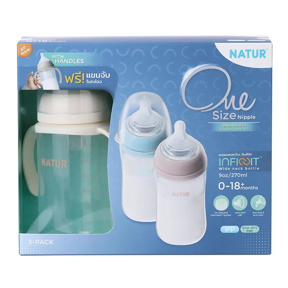 เนเจอร์ ขวดนมคอกว้าง อินฟินิท 9 ออนซ์ แพ็ค 3 แถมแขนจับ คละสี