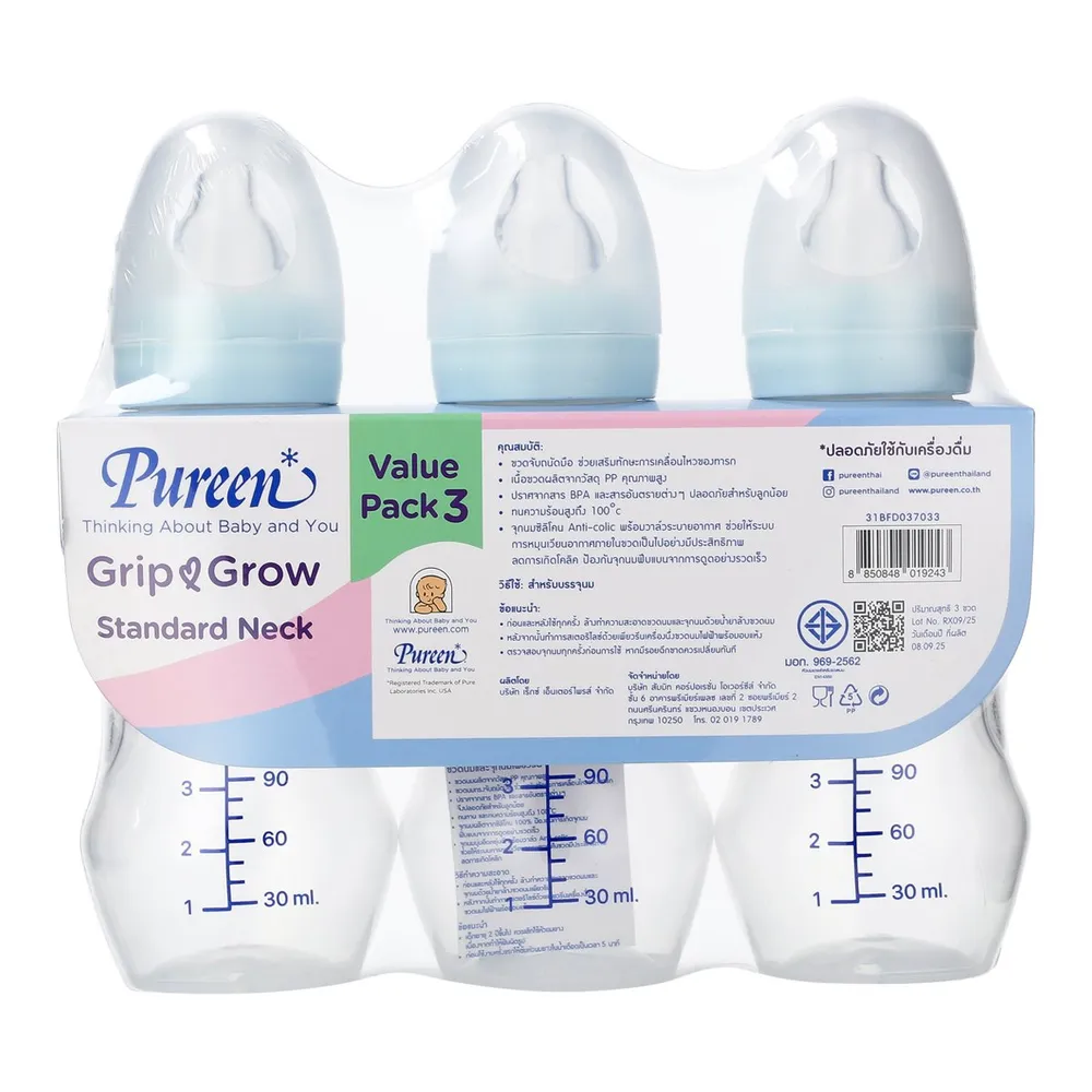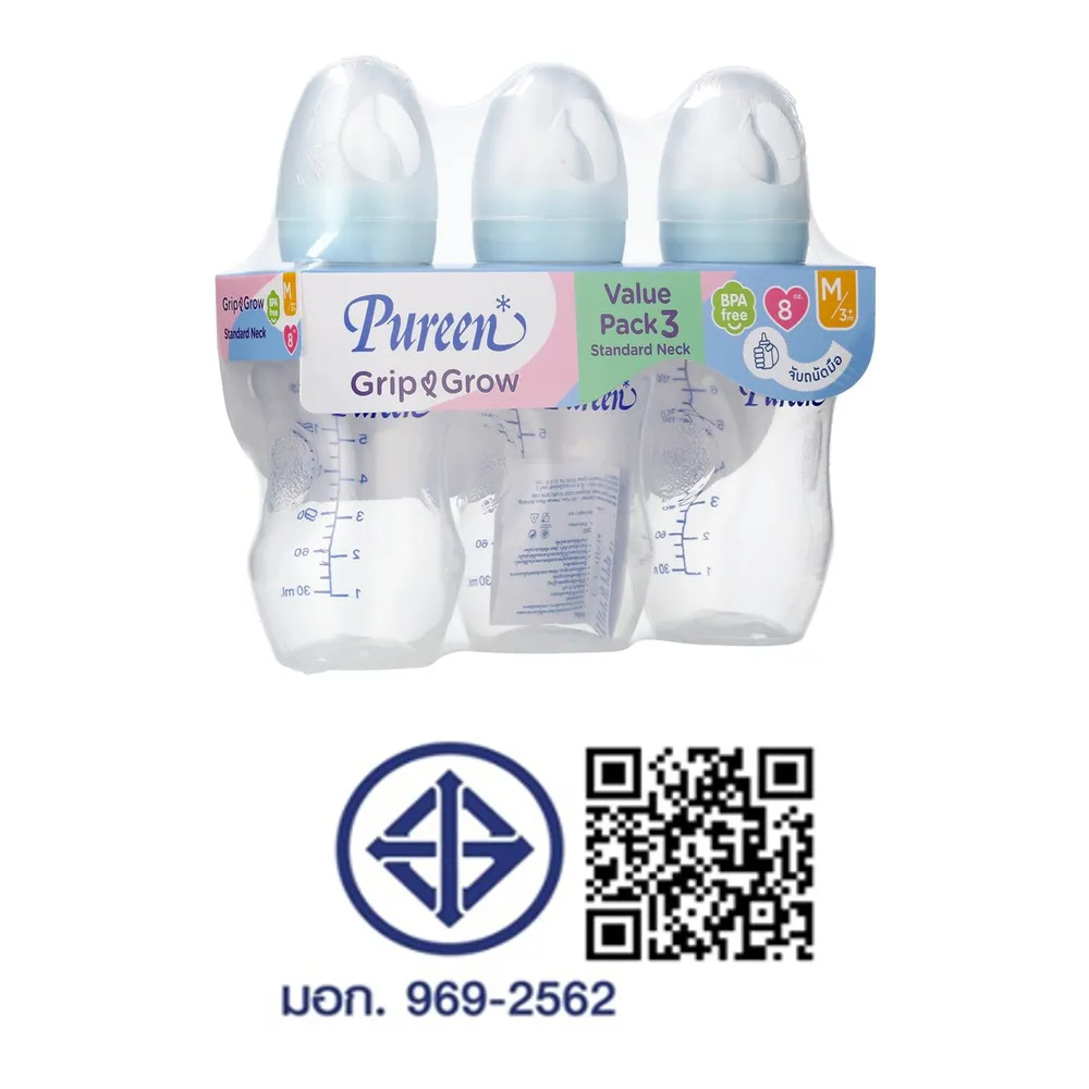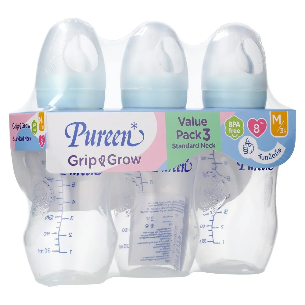 เพียวรีน กริป แอนด์ โกรว์ ขวดนมทรงมาตรฐาน 8 ออนซ์ แพ็ค 3 สีใส