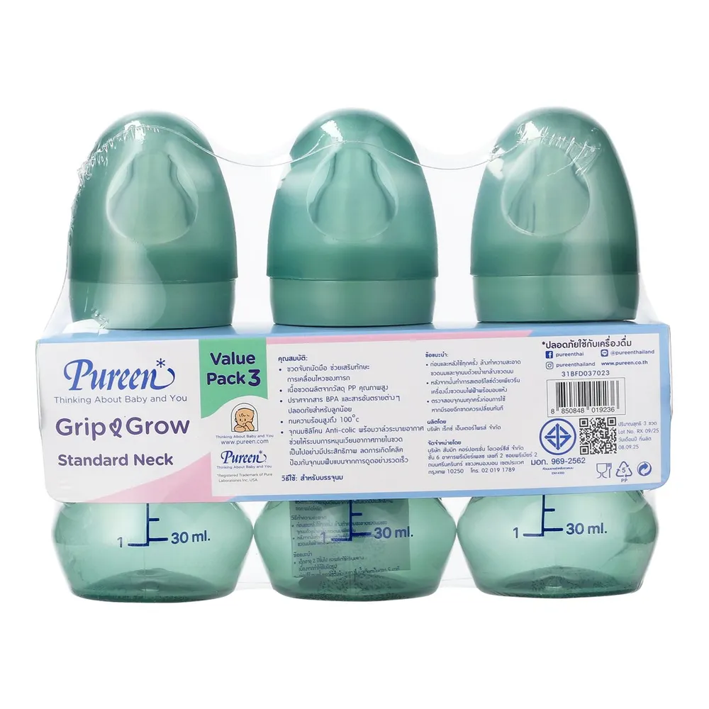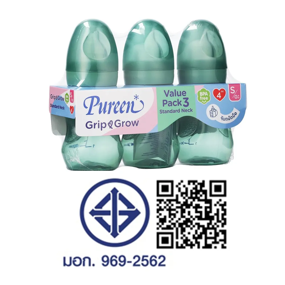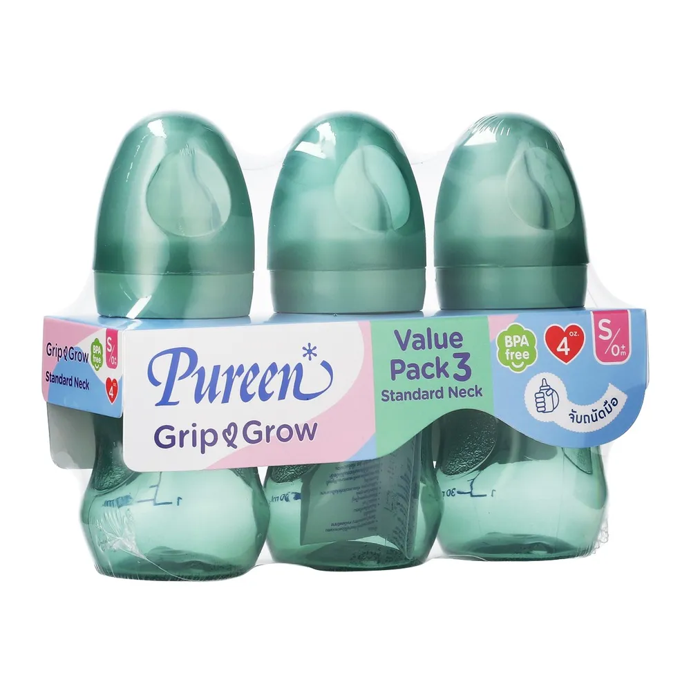 เพียวรีน กริป แอนด์ โกรว์ ขวดนมทรงมาตรฐาน 4 ออนซ์ แพ็ค 3 สีเขียว