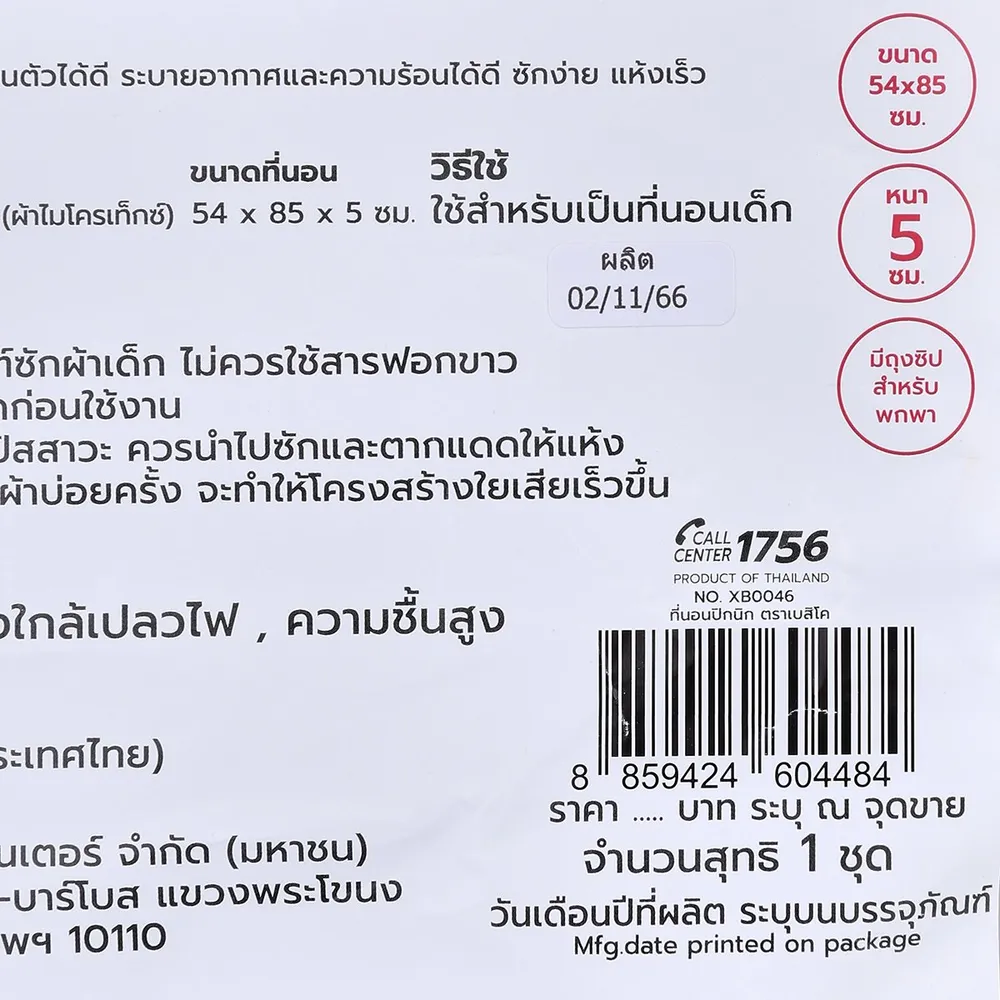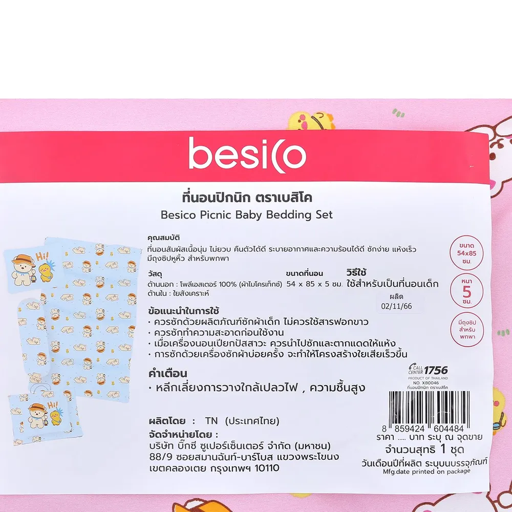 <p>เบสิโค ที่นอนปิกนิก รุ่น XB0046<br /><br />Besico มีหลากหลายผลิตภัณฑ์เพื่อการดูแลอย่างอ่อนโยน ครบครันสำหรับทุกความต้องการของคุณแม่คุณพ่อ<br /><br />- Besico ที่นอนปิกนิก<br />- วัสดุ ด้านนอก: โพลีเอสเตอร์ 100% (ผ้าไมโครเท็กซ์) ด้านใน: ใยสังเคราะห์<br />- ขนาด 54 x 85 x 5 ซม.<br />- เนื้อสัมผัสนุ่ม ไม่ยวบ คืนตัวได้ดี<br />- ระบายอากาศและความร้อนได้ดี<br />- ซักง่าย แห้งเร็ว<br />- มีถุงซิปหูหิ้ว สำหรับพกพา<br />- ลวดลายตัวการ์ตูนน่ารัก<br /><br /><span style="color: #ff0000;">ขอสงวนสิทธิ์ในการเลือกแบบสินค้า ลูกค้าจะได้รับสินค้าเพียงชิ้นเดียว และทางเราจะจัดส่งตามสต๊อกสินค้าโดยไม่ได้แจ้งให้ทราบล่วงหน้า</span><br /><br />*สีของสินค้าอาจมีความแตกต่าง ขึ้นอยู่กับการตั้งค่าของแต่ละหน้าจอ และภาพประกอบใช้เพื่อการโฆษณาเท่านั้น</p>