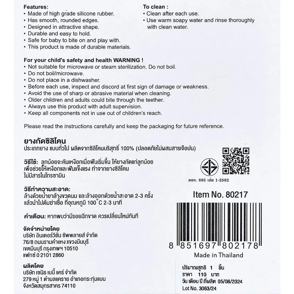 - วิธีใช้: ลูกน้อยจะคันเหงือกเมื่อฟันเริ่มขึ้น ให้ยางกัดแก่ลูกน้อย เพื่อช่วยให้เหงือกและฟันแข็งแรง ทำจากยางซิลิโคน<br />
