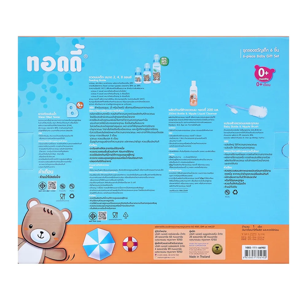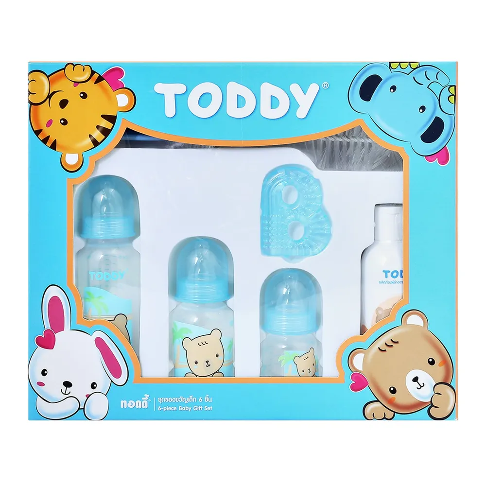 ทอดดี้ ชุดกล่องของขวัญเล็ก 6 ชิ้น รุ่น GST-MIXI ประกอบด้วยของใช้จำเป็นอย่างครบครัน เหมาะสำหรับเด็กอายุ 0 เดือนขึ้นไป ในชุดประกอบด้วย ยางกัดเล่นน้ำ ขวดนม น้ำยาล้างขวดนม และแปรงล้างขวดนม ที่ผ่านการคัดสรรมาเป็นอย่างดี เหมาะสำหรับเป็นของขวัญของฝากต้อนรับสมาชิกใหม่ของบ้าน<br />
