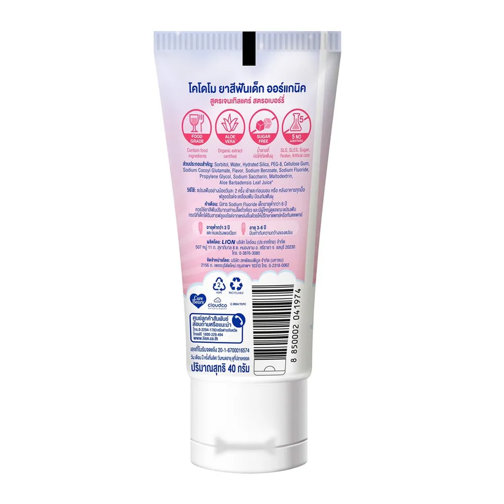 - สูตร Sugar free ที่ไม่ก่อให้เกิดฟันผุ และ ปราศจากสาร SLS, SLES, SUGAR, PARABEN, ARTIFICIAL COLOR มีรสสตรอเบอร์รี่ที่เด็กชื่นชอบ<br />