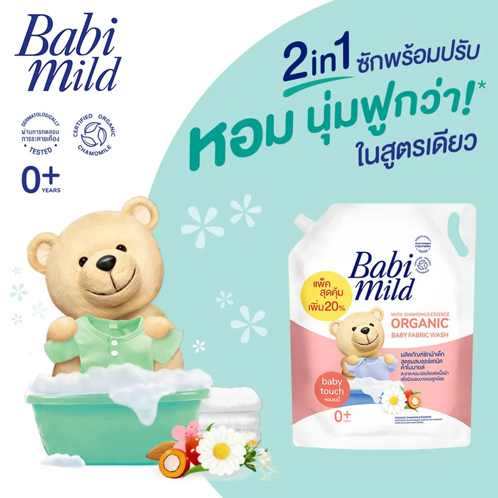 ผลิตภัณฑ์ซักผ้าที่มีความอ่อนโยนต่อผ้าและผิวสูงอย่าง เบบี้มายด์ ผลิตภัณฑ์ซักผ้าเด็ก สูตรผสมออร์แกนิคคาโมมายล์ ผลิตภัณฑ์ซักผ้าคุณภาพดีเยี่ยมที่ผ่านการทดสอบโดยผู้เชี่ยวชาญว่าไม่ก่อให้เกิดการระคายเคืองต่อผิว สามารถใช้ได้ทั้งครอบครัว<br />