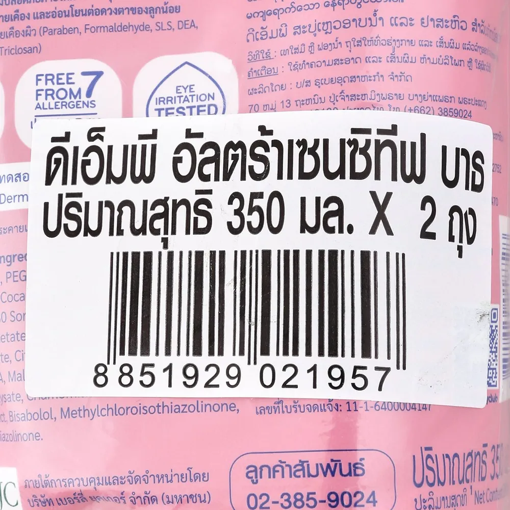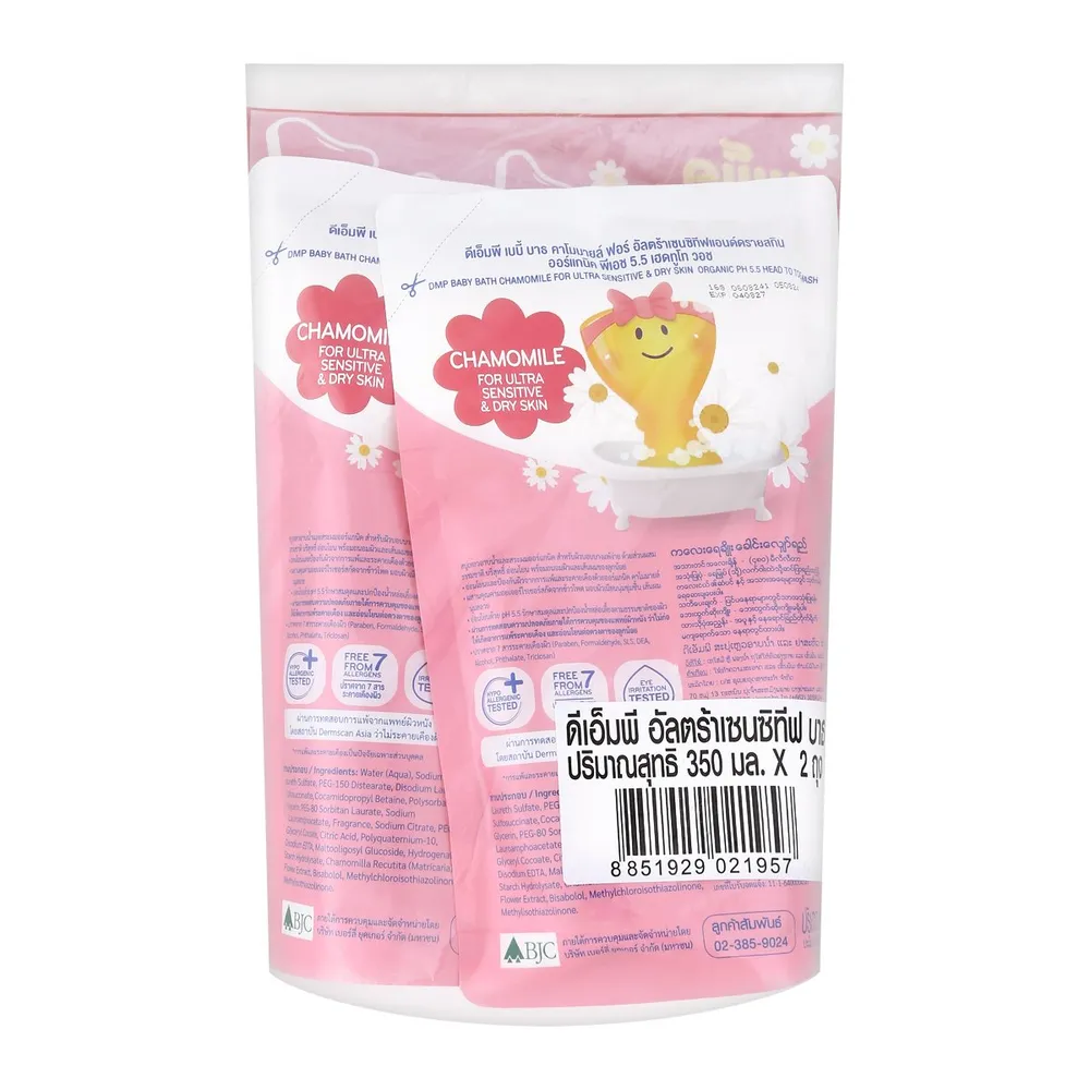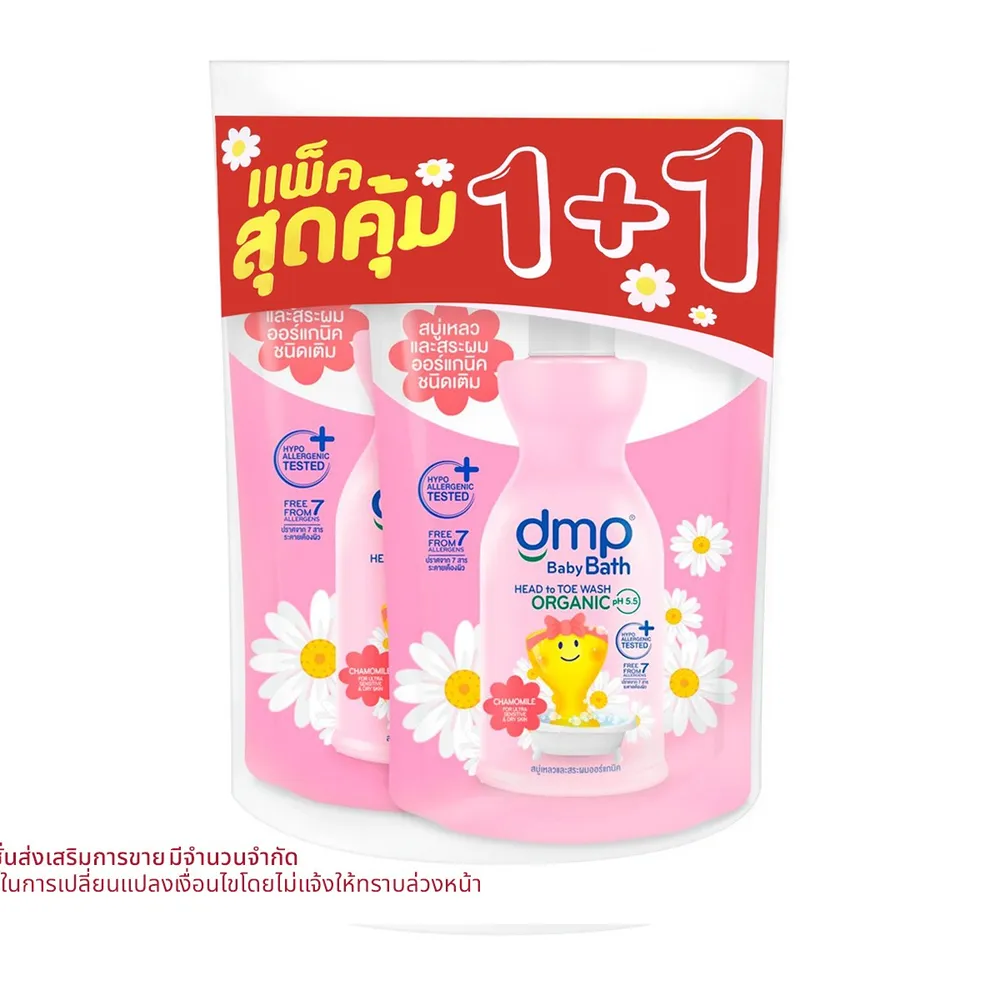 <p>ดีเอ็มพี สบู่อาบน้ำและสระผมออร์แกนิค สำหรับผิวบอบบางแพ้ง่าย<br /> <br /> เดอร์มาพอน เปลี่ยนเป็น "ดีเอ็มพี"​ อาบสะอาด อ่อนโยนต่อผิวลูกน้อยด้วย DMP ผลิตภัณฑ์อาบน้ำและสระผมสำหรับเด็ก ช่วยปกป้องผิวอย่างอ่อนโยนด้วยสูตรออร์แกนิค pH-balanced 5.5 เหมาะสำหรับผิวเด็กและผิวแพ้ง่าย ปราศจาก 7 สารระคายเคืองผิว พร้อมทั้งผ่านการทดสอบว่าไม่ทำให้แพ้ระคายเคืองโดยแพทย์ผิวหนัง<br /> <br /> - ดีเอ็มพี ออร์แกนิค พีเอช 5.5 แฮร์แอนด์บอดี้ เบบี้บาธ อัลตร้ามายด์ เซนซิทีฟ แอนด์ ดรายสกิน<br /> - อ่อนโยนต่อผิวแพ้ง่ายและผิวแห้ง สูตร soapless ไร้สารสบู่<br /> - พร้อมไบซาบอลอลและออร์แกนิค คาโมมายล์ ลดโอกาสแพ้ระคายเคืองผิว<br /> - มอยเจอร์ไรเซอร์สกัดจากข้าวโพด มอบผิวเนียนนุ่มชุ่มชื้น เส้นผมนุ่มสลวย<br /> - อ่อนโยนด้วย pH Balanced 5.5 ช่วยรักษาสมดุลและปกป้องน้ำหล่อเลี้ยงตามธรรมชาติของผิวทารก<br /> - ผ่านการทดสอบว่าอ่อนโยน ไม่ระคายเคืองต่อดวงตาของลูกน้อย<br /> - ผ่านการทดสอบการแพ้จากสถาบันชั้นนำด้านผิวหนัง Dermscan Asia ว่าปลอดภัย ไม่ระคายเคืองผิว<br /> <br /><span style="color: #ff0000;">*บริษัทฯ ขอสงวนสิทธิ์ในการปรับเปลี่ยนราคาจำหน่ายและโปรโมชั่น รวมถึงแพ็คเกจและปริมาณสินค้าจากผู้ผลิตได้ตามความเหมาะสม โดยไม่จำเป็นต้องแจ้งให้ทราบล่วงหน้า</span><br /> <br /> *ภาพประกอบใช้เพื่อการโฆษณาเท่านั้น</p>