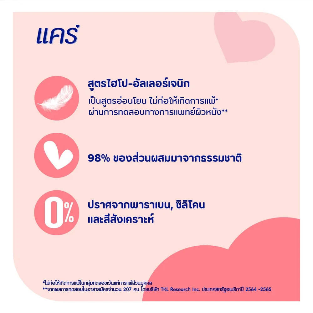 - ผ่านการทดสอบไฮโป-อัลเลอร์เจนิกทางการแพทย์ผิวหนัง ประเทศสหรัฐอเมริกาแล้วว่าเป็นสูตรที่อ่อนโยน ไม่ก่อให้เกิดการแพ้<br />