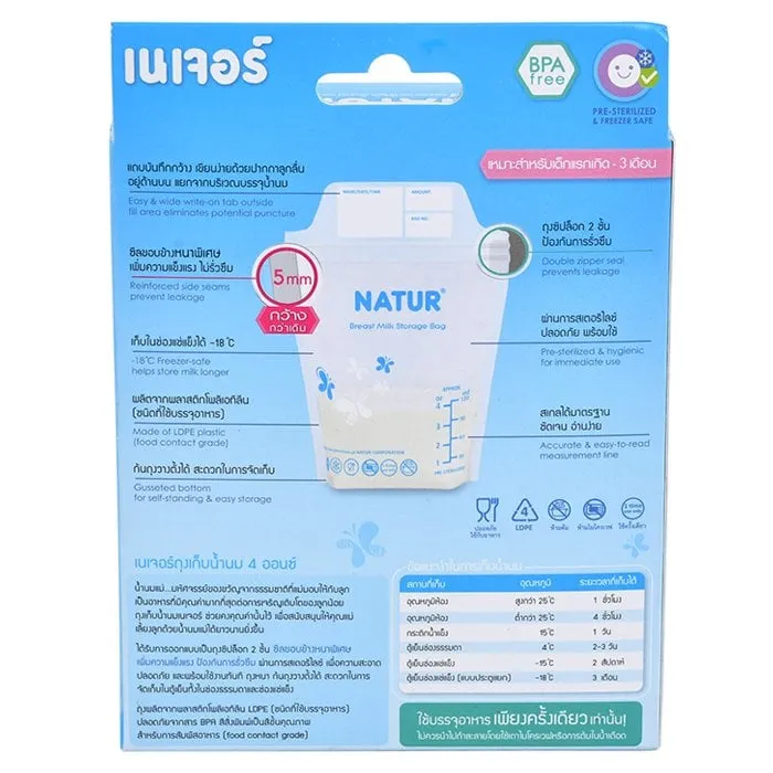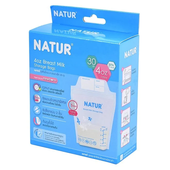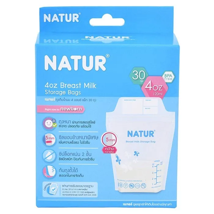 <p>เนเจอร์ ถุงเก็บน้ำนมแม่ ขนาด 4 ออนซ์ แพ็ค 30 ถุง<br /><br />เนเจอร์ ถุงเก็บน้ำนมแม่ ขนาด 4 ออนซ์ ผลิตจากพลาสติก LDPE (ชนิดที่ใช้บรรจุอาหาร) BPA Free สีพิมพ์ชั้นคุณภาพสำหรับการสัมผัสอาหาร (food contract grade) แถบบันทึกด้านบน มีช่องเขียนชื่อ วันที่ เวลา ถุงหนา ผ่านการสเตอริไลซ์ สะอาด ปลอดภัย พร้อมใช้ <br /><br />- ถุงเก็บน้ำนมแม่ ขนาด 4 ออนซ์<br />- ก้นถุงวางตั้งได้ สะดวกในการจัดเก็บ<br />- มีแถบวัดปริมาณน้ำนม ซิปล็อกแน่น 2 ชั้น ซีลปิดสนิท ป้องกันการรั่วซึม<br /><br />