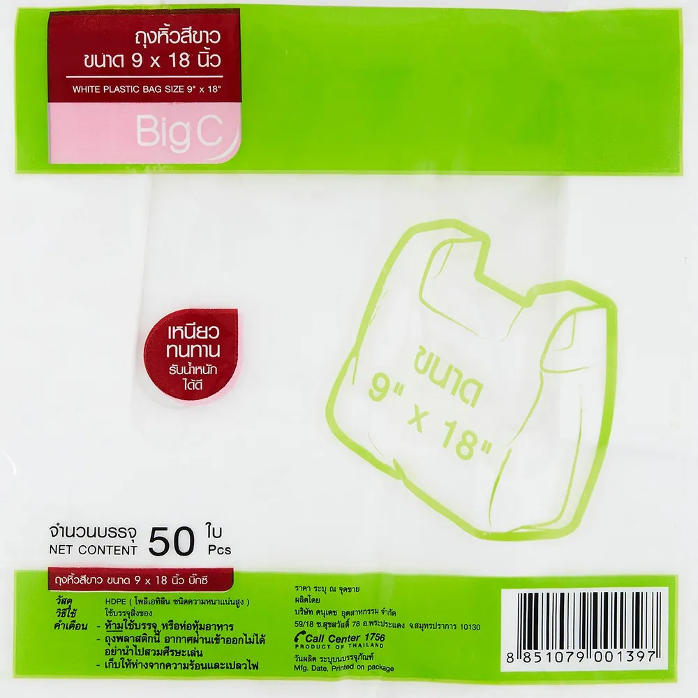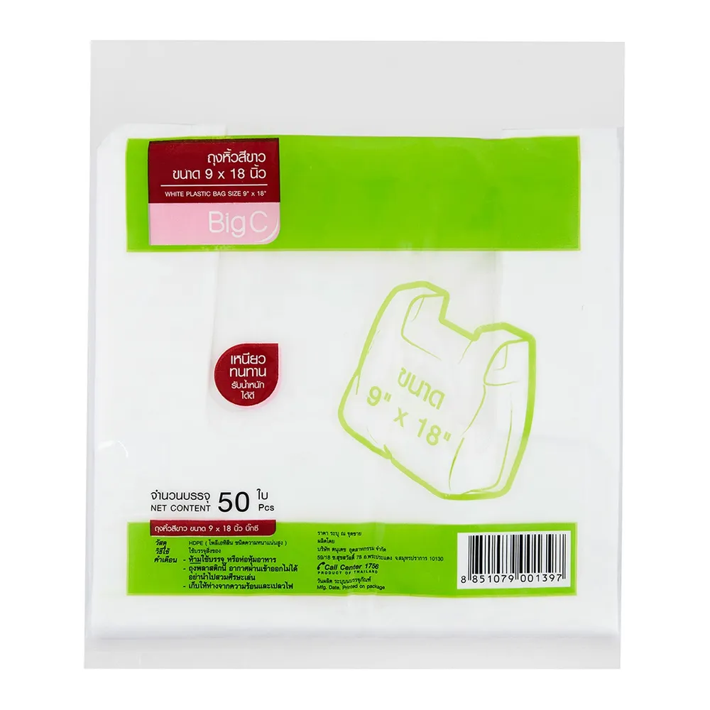 <p>ถุงหูหิ้ว ผลิตจากพลาสติดคุณภาพดี เหนียว และคงทน<br /> เหมาะสำหรับใส่สิ่งของ สินค้า และอาหารในบรรจุภัณฑ์<br /> มั่นใจได้ในสินค้าตราบิ๊กซี (BigC)<br /> ขนาด9 x18 นิ้ว / 50 ใบ</p>
