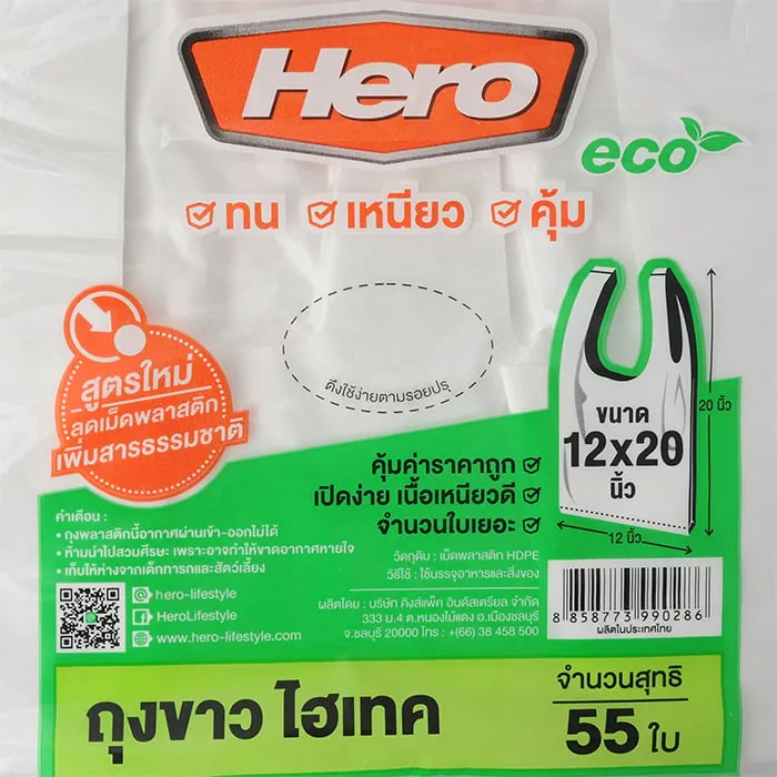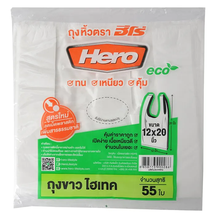 ฮีโร่ ถุงหิ้วขาวไฮเทค 12X20 นิ้ว แพ็ค 55 ใบ