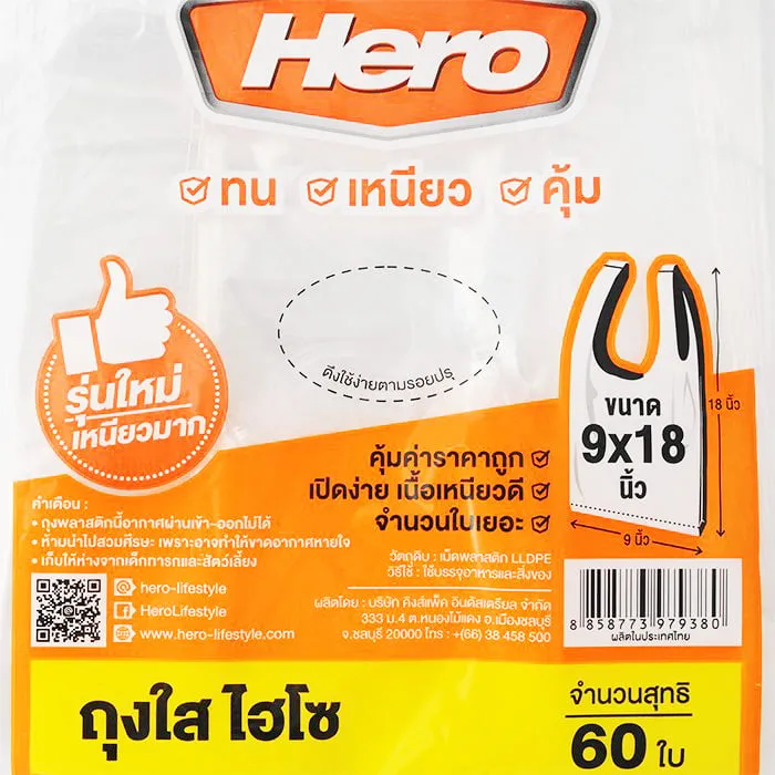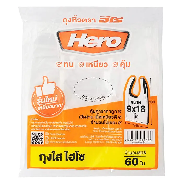 <p>ฮีโร่ ถุงหูหิ้วใสไฮโซ ขนาด 9X18 นิ้ว แพ็ค 60 ใบ<br />