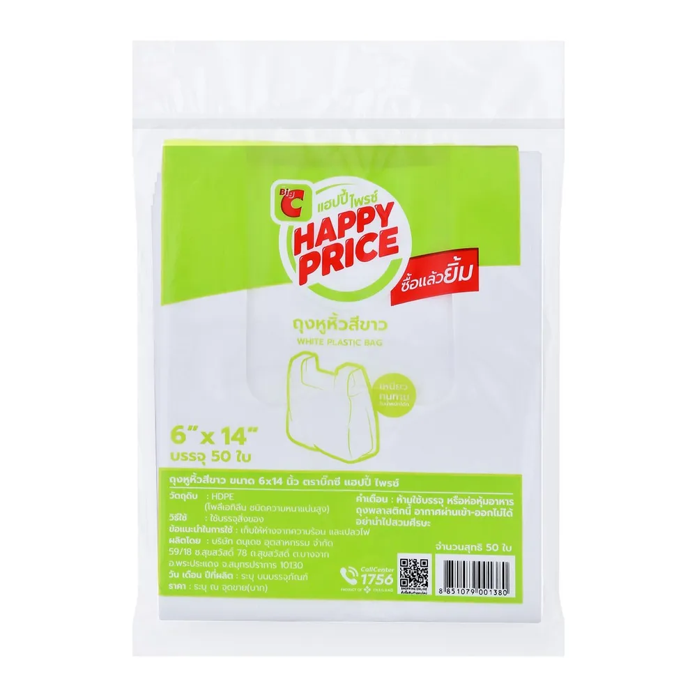 ถุงพลาสติกสีขาว ขนาด 6 x 14 นิ้วจากบิ๊กซี ผลิตจากวัสดุ HDPE หรือโพลิเอทิลีน ชนิดความหนาแน่นสูง มีอายุการใช้งานได้นาน นำกลับมาใช้ซ้ำได้หลายครั้ง เหมาะสำหรับบรรจุสิ่งของอเนกประสงค์ แต่ห้ามใช้บรรจุหรือห่อหุ้มอาหาร<br />