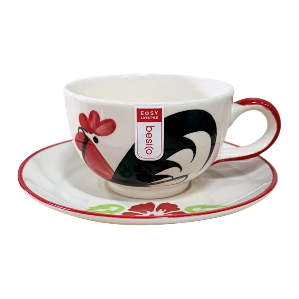 - แก้วและจานรองแก้วเซรามิก ที่มีลวดลายดอกชบาและไก่ที่เป็นเอกลักษณ์<br />