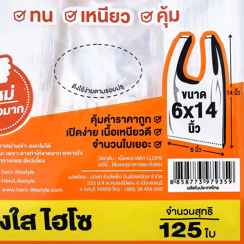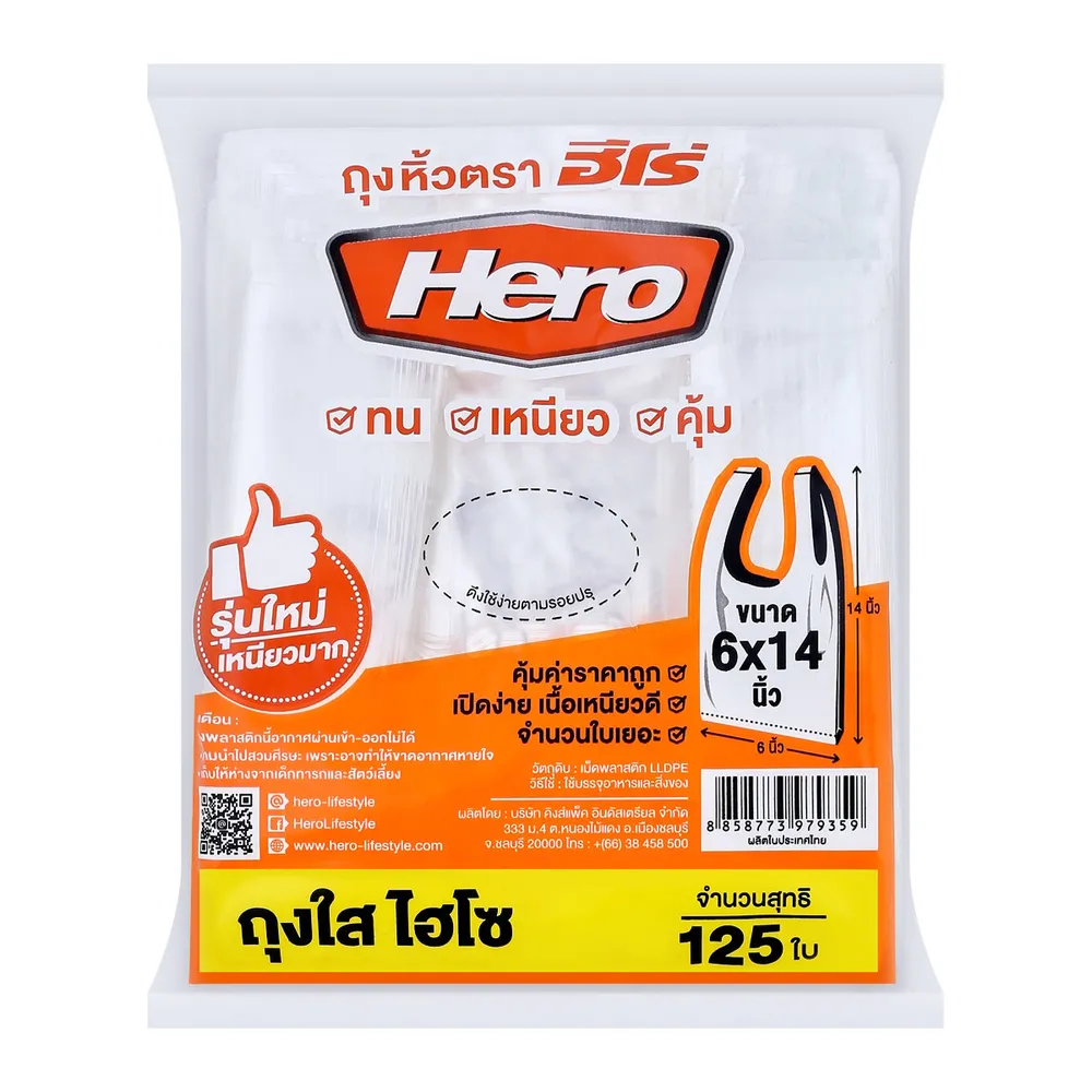 <p>ฮีโร่ ถุงหูหิ้วใสไฮโซ ขนาด 6X14 นิ้ว แพ็ค 125 ใบ<br />