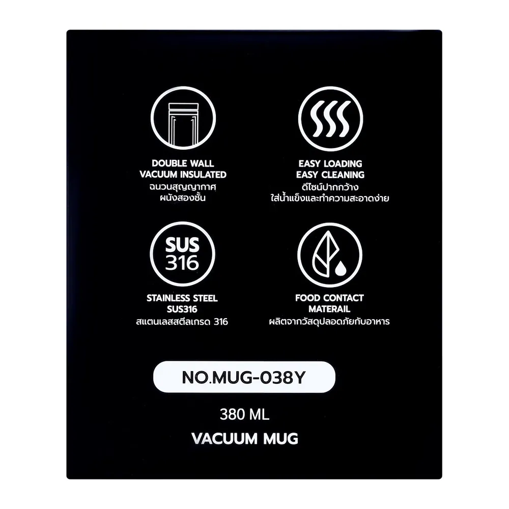 เบสิโค แก้วน้ำสุญญากาศ 380 มล. รุ่น MUG-038Y แก้วน้ำเก็บความร้อนและเย็นแบบ Double-Wall Vacuum Insulated ของเบสิโค ที่ออกแบบมาเพื่อเก็บเครื่องดื่มให้เย็นในฤดูร้อนหรือร้อนในฤดูหนาว ตัวเลือกสำหรับแก้วน้ำใช้ที่ทำงานหรือที่บ้าน เหมาะกับทุกไลฟ์สไตล์ของคุณ<br />