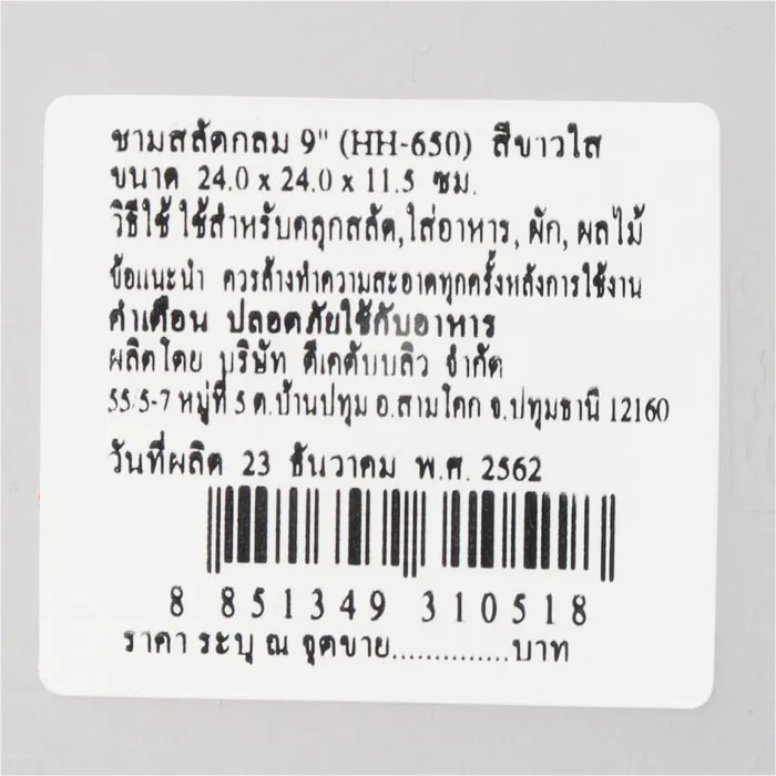 <p>ดีเคดับบลิว ชามสลัดกลม ขนาด 9 นิ้ว รุ่น HH-650 สีขาวใส <br /><br />ดีเคดับบลิว ชามสลัดกลม สีขาวใสคุณภาพดีที่ผลิตจากพลาสติกโพลิโพรพิลีนเกรดคุณภาพ มีความหนา เหนียว ไม่แตกหักง่ายใช้งานได้ทนทานยาวนาน ตัวชามมีประสิทธิภาพในการทนความร้อนได้ดี ไม่มีสารตกค้าง ออกแบบมาให้มีรูปทรงที่ทันสมัย เหมาะกับการใช้งานทุกครัวเรือน<br /><br />- ง่ายต่อการทำความสะอาด <br />- อายุการใช้งานยาวนาน แข็งแรงทนทาน<br />- ขนาด 9 นิ้ว รุ่น HH-650 สีขาวใส <br />- ผลิตมาอย่างมีคุณภาพสามารถใช้กับอาหารได้ดี<br /><br />*ภาพประกอบใช้เพื่อการโฆษณาเท่านั้น</p>