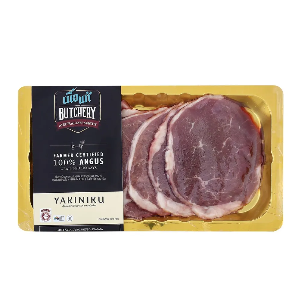 เนื้อแท้ บุชเชอรี่ อายราวนด์วัวออสเตรเลียแองกัสขุนธัญพืช 120 วัน (ยากินิกุ) สไลด์แช่แข็ง 200 ก.