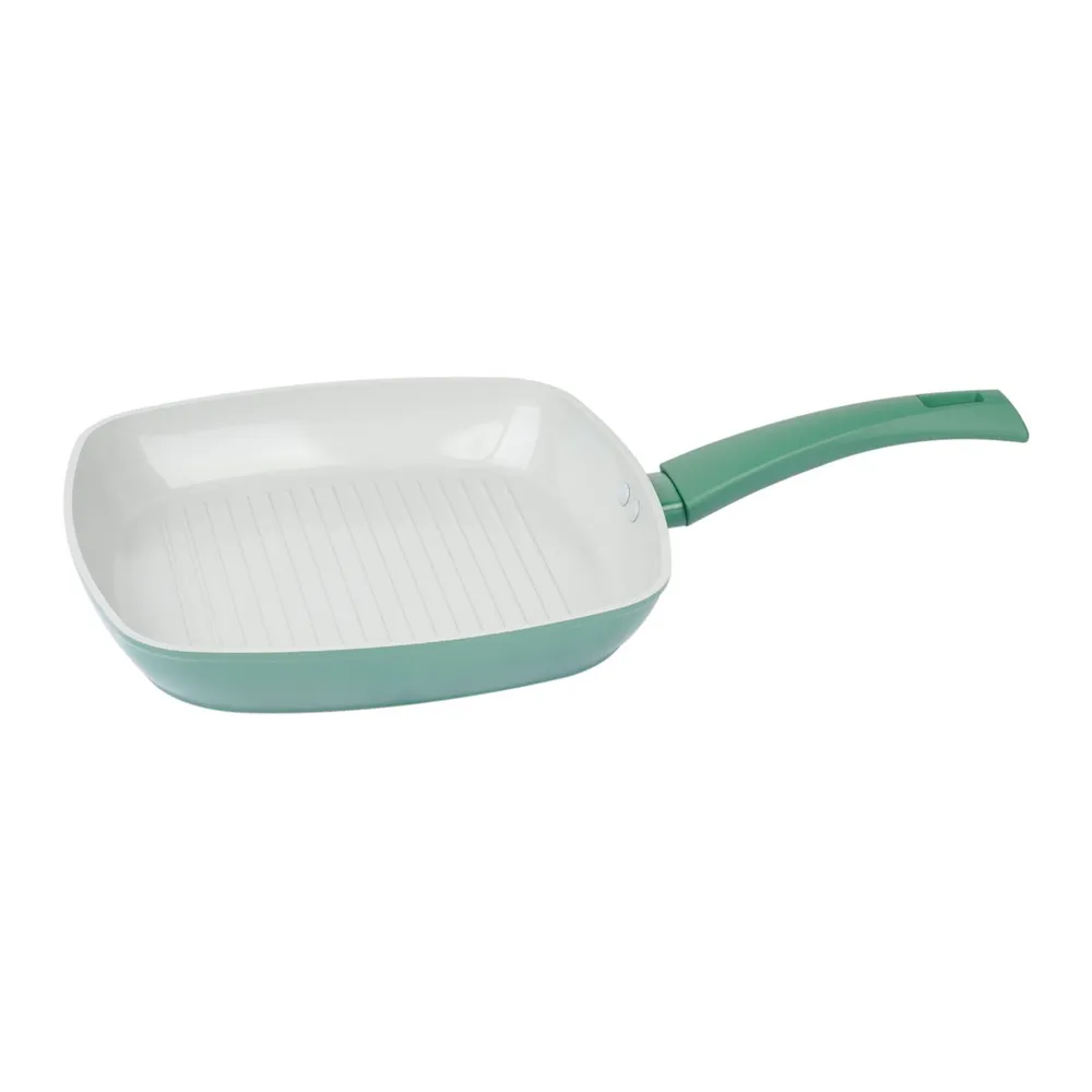 กระทะทำจากอะลูมิเนียมเคลือบเซรามิก ใช้สำหรับทำอาหารประเภทย่าง เนื้อสัตว์ ปลา ไม่ต้องใช้น้ำมัน ไม่ติดกระทะ<br />