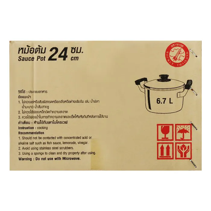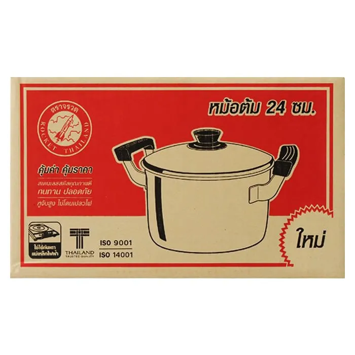 <p>ตราจรวด หม้อต้ม 24 ซม.<br /><br />ตราจรวด หม้อต้ม 24 ซม. ผลิตจากสเตนเลลสคุณภาพดี มีความแข็งแรง ทนทาน อายุการใช้งานยาวนาน มาพร้อมฝาปิดมีที่จับสะดวกต่อการใช้งาน ได้รับการออกแบบมาอย่างดีให้เหมาะกับการต้ม รูปทรงมาตรฐาน เหมาะสำหรับทุกครัวเรือน<br /><br />- ผลิตจากสเตนเลสสตีลคุณภาพดี <br />- ทนทาน ปลอดภัยต่อสุขภาพ<br />- รูปทรงมาตรฐาน ใช้งานได้ดีในครัวเรือน<br />- หูจับเบกาไลท์ออกแบบให้สูงไม่โดนไฟลาม<br />- ห้ามใช้กับเตาไมโครเวฟ และกรดเข้มข้น<br /><br /><span style="color: #ff0000;">สินค้าที่ได้รับอาจมีการปรับเปลี่ยนแพ็คเกจและปริมาณจากผู้ผลิต ขออนุญาตสงวนสิทธิ์ในการเปลี่ยนแปลงดังกล่าว โดยไม่แจ้งให้ทราบล่วงหน้า<br /><br /></span>*ภาพประกอบใช้เพื่อการโฆษณาเท่านั้น</p>