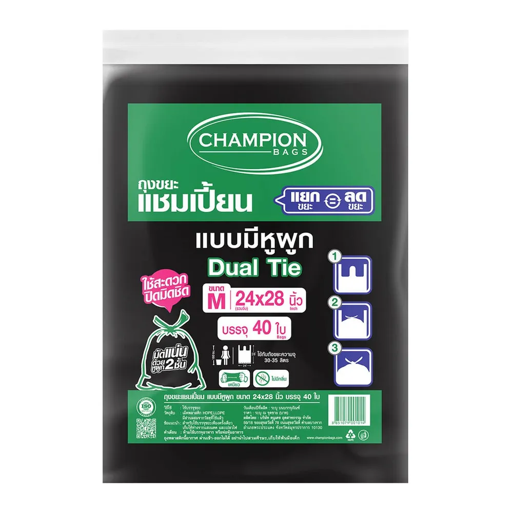 แชมเปี้ยน ถุงขยะ แบบมีหูผูก 24x28 นิ้ว สีดำ แพ็ค 40 ใบ
