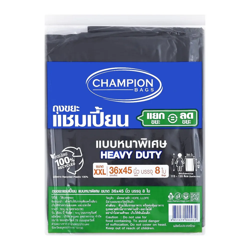 แชมเปี้ยน ถุงขยะ แบบหนาพิเศษ 36x45 นิ้ว สีดำ แพ็ค 8 ใบ