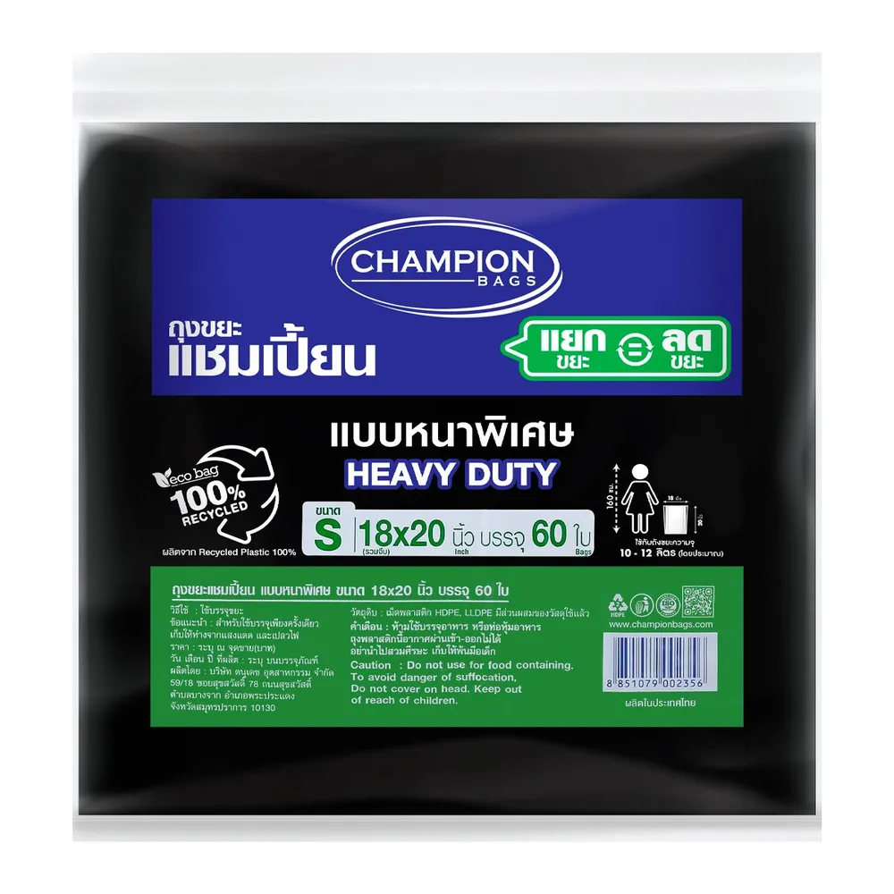 แชมเปี้ยน ถุงขยะ แบบหนาพิเศษ 18x20 นิ้ว สีดำ แพ็ค 60 ใบ
