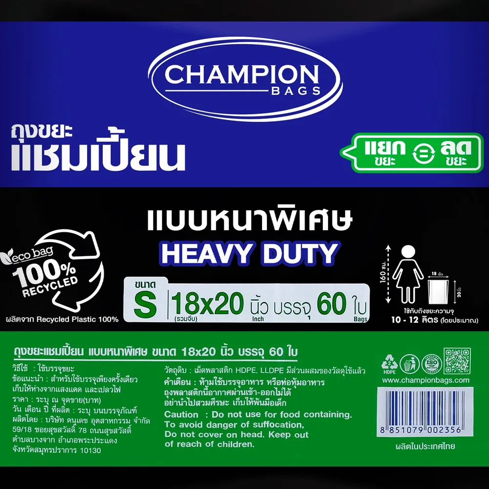 แชมเปี้ยน ถุงขยะ แบบหนาพิเศษ 18 x 20 นิ้ว ถุงขยะคุณภาพมาตรฐาน เนื้อเหนียว แข็งแรง ทนทาน รับน้ำหนักได้มาก ให้คุณจัดการเรื่องขยะได้อย่างง่ายดาย และอำนวยความสะดวกในการแยกขยะประเภทต่างๆ ได้สะดวกสบายมากยิ่งขึ้น<br />