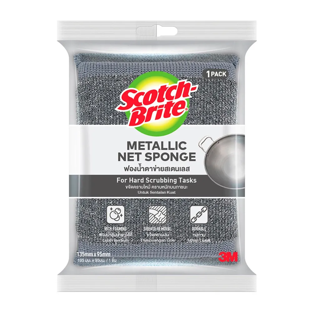 สก๊อตซ์-ไบรต์ 3M ฟองน้ำตาข่ายสเตนเลส ใช้ทำความสะอาดภาชนะ และพื้นผิวโลหะ เช่น เครื่องครัว หม้อ กระทะ ตะแกรงที่เป็นเหล็ก หรือสเตนเลส เป็นต้น ฟองน้ำอุ้มน้ำยาได้ดี ขจัดคราบมันได้ดี และทนทาน<br />