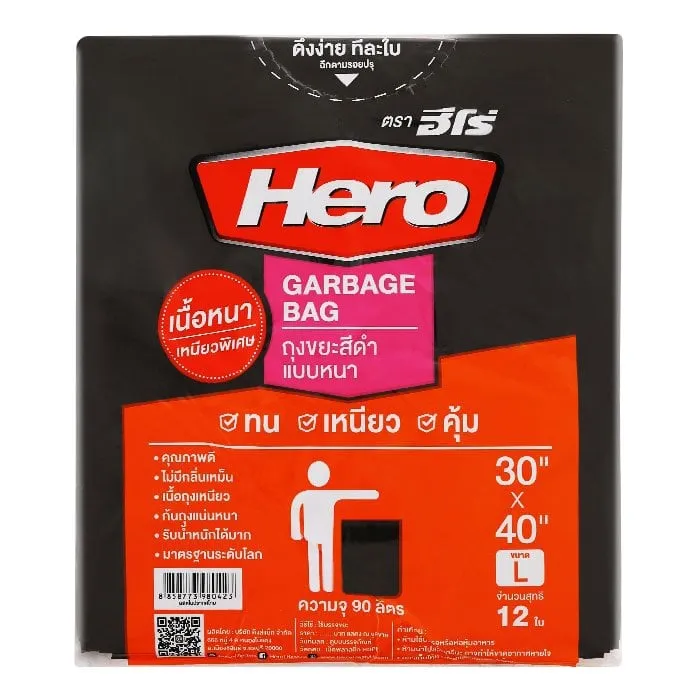 <p>ฮีโร่ ถุงขยะสีดำ แบบหนา ขนาด 30x40 นิ้ว 12 ใบ<br /><br />ฮีโร่ ถุงขยะสีดำ แบบหนา ขนาด 30x40 นิ้ว 12 ใบ ผลิตจากพลาสติกเกรดคุณภาพ มีความเหนียว แข็งแรง ไม่มีกลิ่นเหม็น สามารถรับน้ำหนักได้มาก จึงเหมาะสำหรับขยะหนักๆ เพิ่มความสะดวกให้กับคุณมากยิ่งขึ้น<br /><br />- รับน้ำหนักได้มาก<br />- ความจุ 90 ลิตร<br />- สะดวก ดึงใช้ได้ทีละใบ<br />- ปราศจากกลิ่น<br />- คุณภาพดี เนื้อหนา เหนียวพิเศษ<br /><br />*ภาพประกอบใช้เพื่อการโฆษณาเท่านั้น</p>