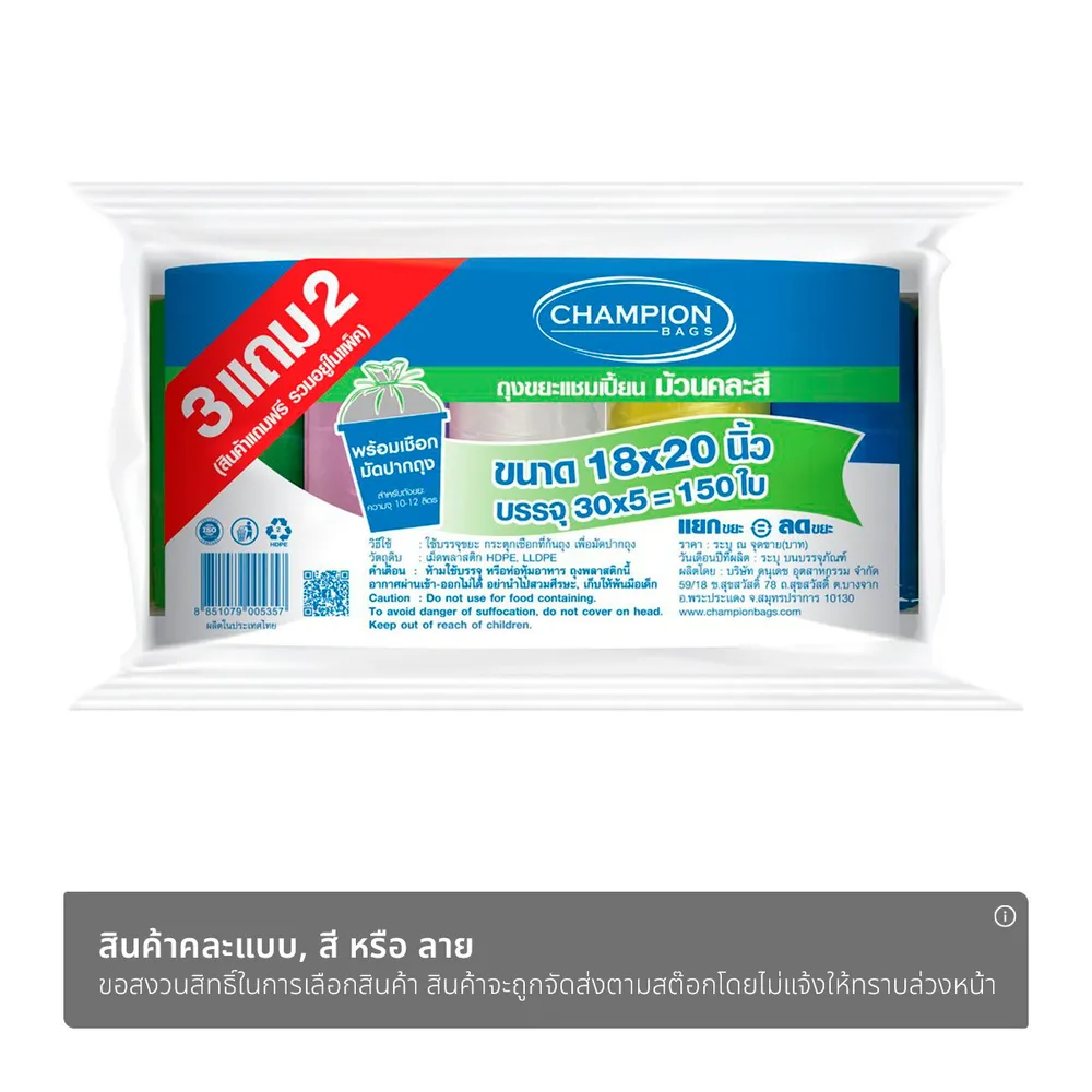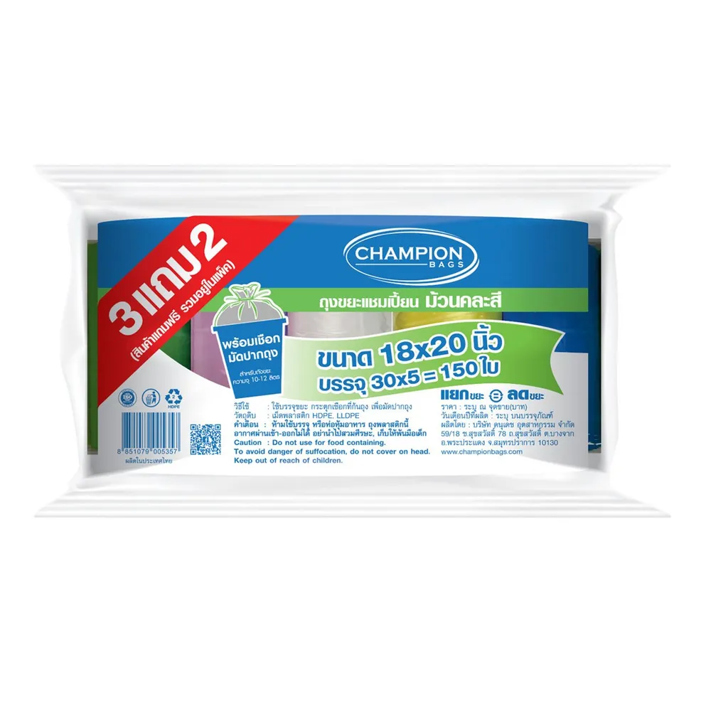 แชมเปี้ยน ถุงขยะแบบม้วน ขนาด 18X20 นิ้ว แพ็ค 3+2 รวม 150 ใบ คละสี