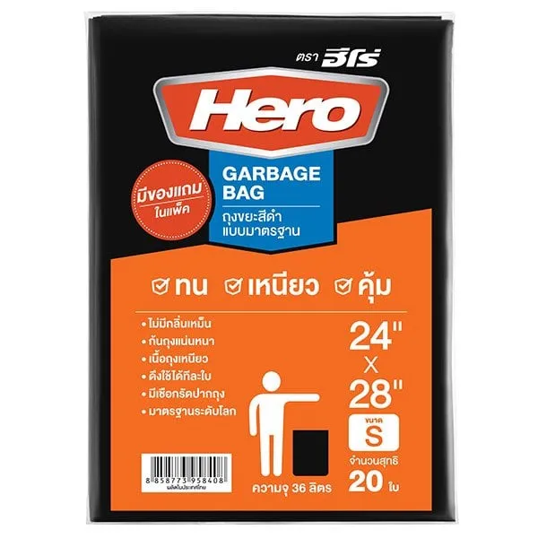 ฮีโร่ ถุงขยะ รุ่นมาตรฐาน สีดำ ขนาด 24x28 นิ้ว แพ็ค 20 ใบ