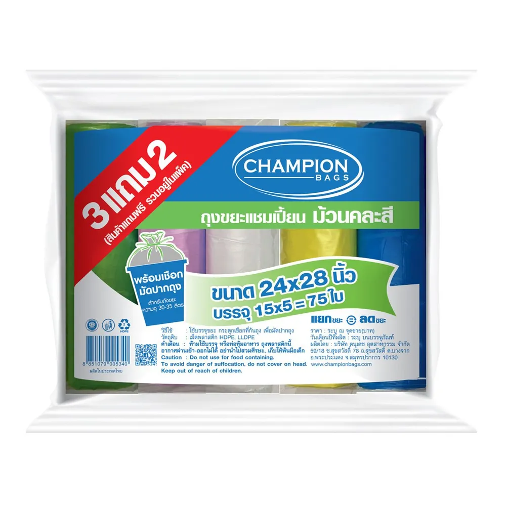 แชมเปี้ยน ถุงขยะแบบม้วน ขนาด 24x28 นิ้ว แพ็ค 3+2 รวม 75 ใบ คละสี