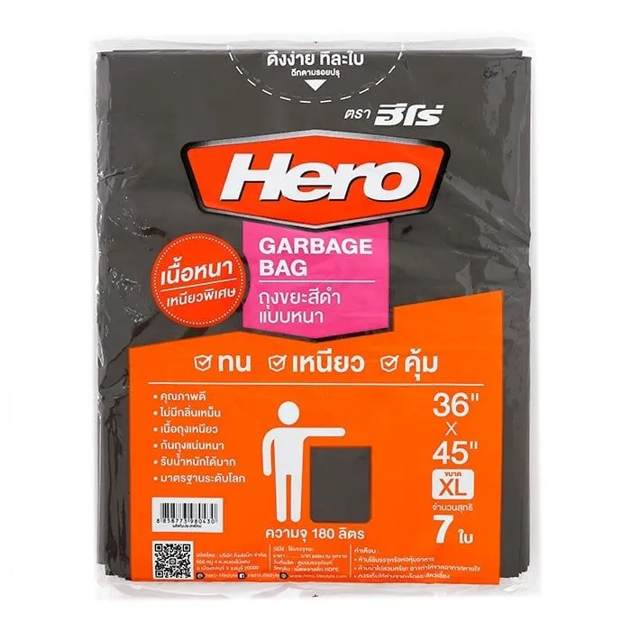 <p>ฮีโร่ ถุงขยะสีดำแบบหนา ขนาด XL ถุง 7 ใบ<br /><br />ฮีโร่ ถุงขยะสีดำแบบหนา ขนาด XL ถุง 7 ใบ ถุงขยะที่เหนียว หนา ไม่มีกลิ่น ถุงขยะคุณภาพเยี่ยมจากฮีโร่ <br /><br />- ฮีโร่ ถุงขยะสีดำแบบหนา <br />- ผลิตจากวัสดุคุณภาพดี เนื้อหนา เหนียวเป็นพิเศษ <br />- เนื้อถุงเหนียว ก้นถุงแน่นหนา รับน้ำหนักได้มาก มาตรฐานระดับโลก<br />- ไม่มีกลิ่นเหม็นของถุง<br />- ความจุ 180 ลิตร <br />- ขนาด M 36 x 45 นิ้ว <br />- ใช้สำหรับบรรจุขยะเพื่อทิ้ง ห้ามนำไปบรรจุอาหาร<br /><br />*ภาพประกอบใช้เพื่อการโฆษณาเท่านั้น</p>