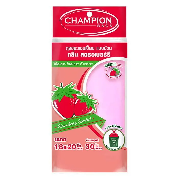 <p>แชมเปี้ยน ถุงขยะ แบบม้วน กลิ่นสตรอว์เบอร์รี่ ขนาด 18 x 20 นิ้ว<br />
