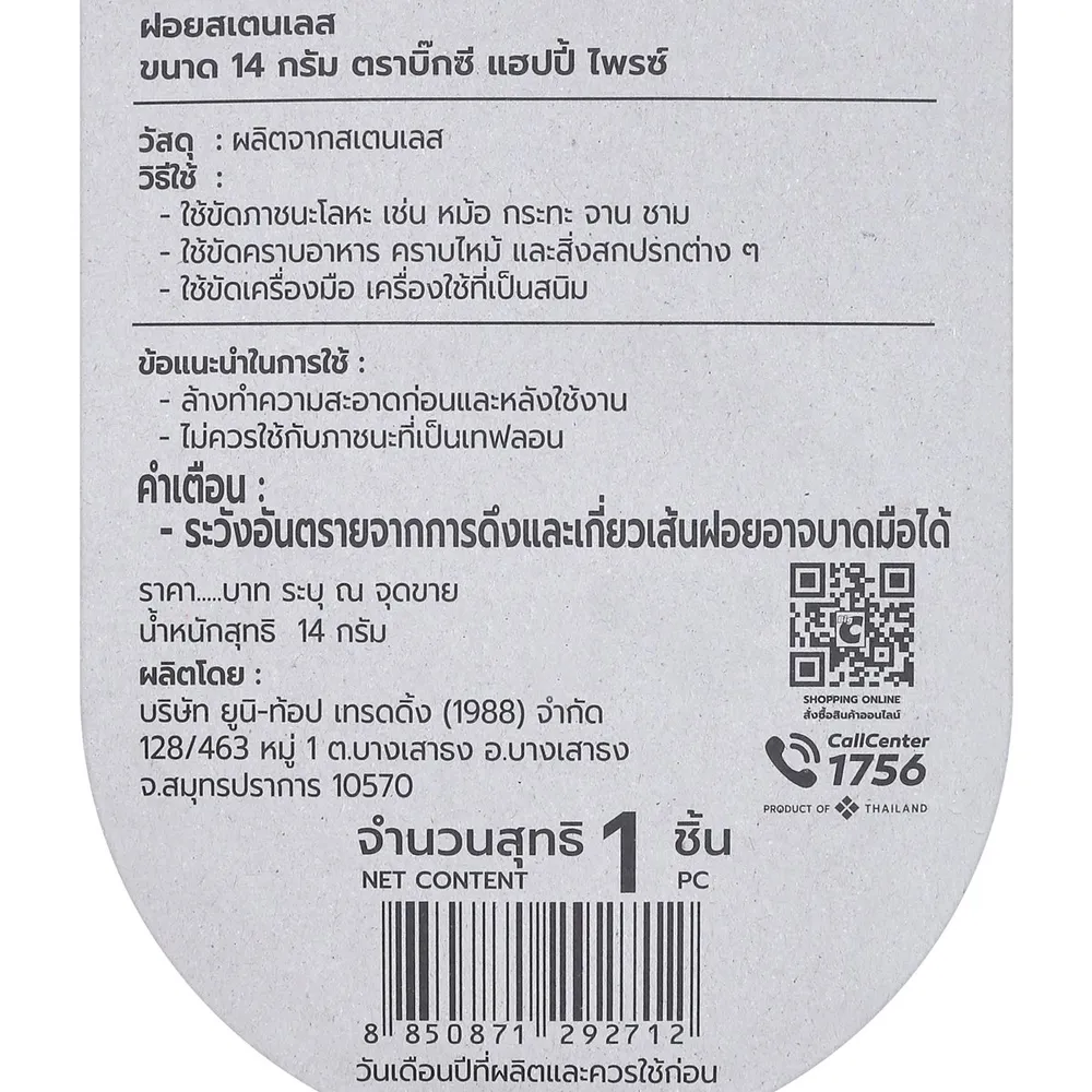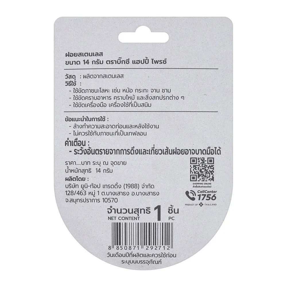 <p>เบสิโค ใยขัดสแตนเลส ขนาด 14 ก. <br /><br />ให้คุณขัดล้างทำความสะอาดเครื่องครัวที่คุณรักด้วย เบสิโค ใยขัดสแตนเลส ใยขัดผลิตจากสแตนเลสคุณภาพดี ขัดสะอาด ทนทาน ให้สัมผัสนุ่มนวลไม่บาดมือ สำหรับขัดกระทะ หม้อ หรือเครื่องครัวอื่นๆ ได้ตามต้องการ<br /><br />- เบสิโค ใยขัดสแตนเลส<br />- ใยขัดผลิตจากสแตนเลสคุณภาพดี <br />- ให้สัมผัสนุ่มนวลไม่บาดมือ<br />- สำหรับขัดภาชนะโลหะ เช่น กระทะ หม้อ จามชามที่มีคราบอาหาร <br />- ใช้ขัดเครื่องมือเครื่องใช้ที่เป็นสนิม<br />- ใช้ขัดเครื่องสุขภัณฑ์ต่างๆ <br />- ขัดสะอาด ทนทาน ใช้งานได้นาน<br /><br />*ภาพประกอบใช้เพื่อการโฆษณาเท่านั้น</p>