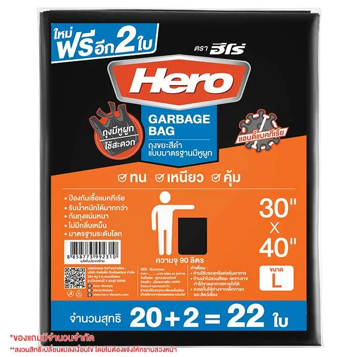 ฮีโร่ ถุงขยะแบบมาตรฐานมีหูผูก รุ่น T-Shirt ขนาด L 30 x 40 นิ้ว แพ็ค 22 ใบ สีดำ