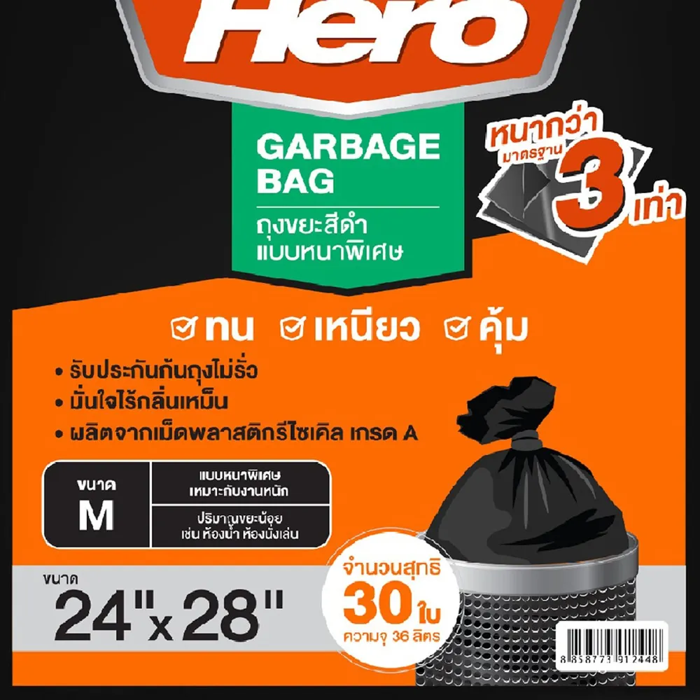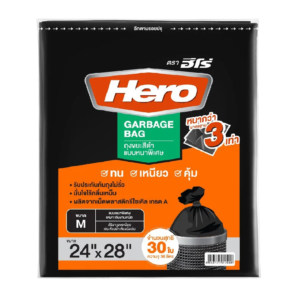 ฮีโร่ ถุงขยะหนา 3 เท่า ขนาด 24 x 28 นิ้ว สีดำ 30 ใบ