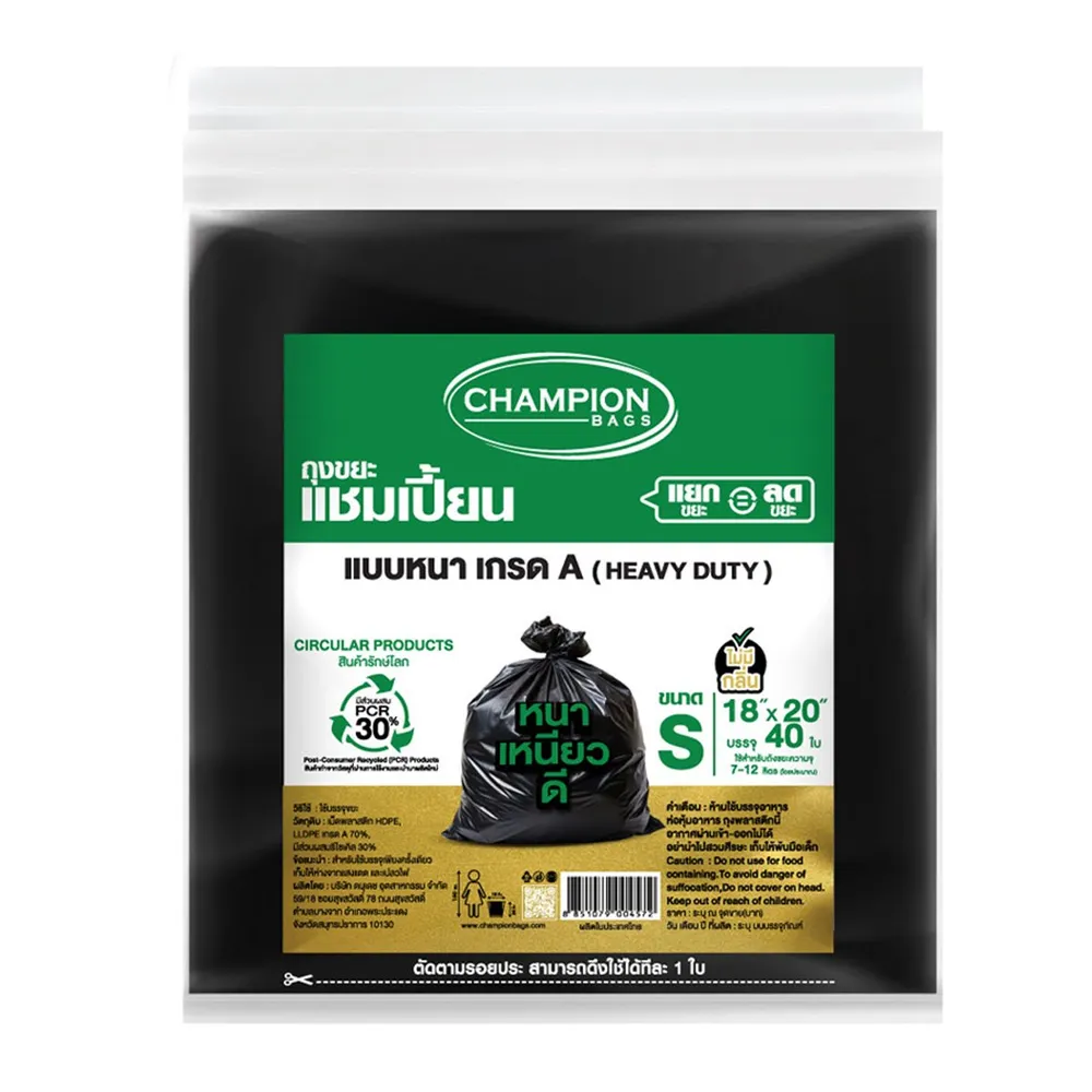 แชมเปี้ยน ถุงขยะสีดำแบบหนา ถุงขยะคุณภาพมาตรฐาน เนื้อเหนียว แข็งแรง ทนทาน รับน้ำหนักได้มาก ให้คุณจัดการเรื่องขยะได้อย่างง่ายดาย<br />