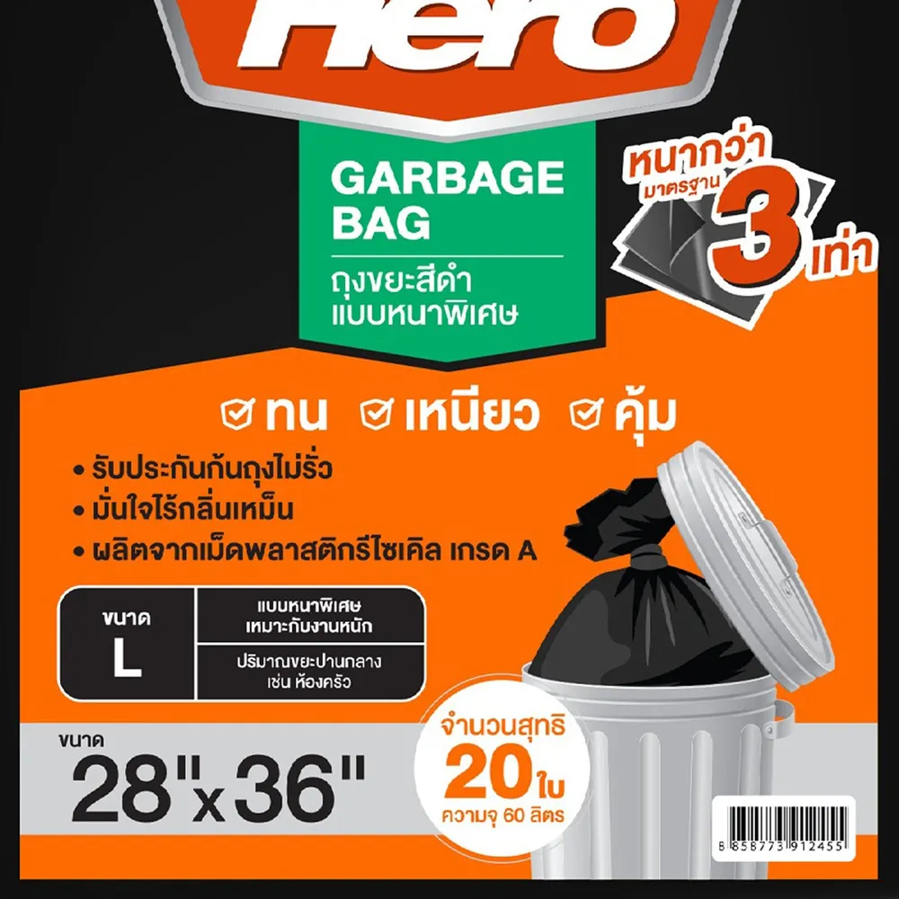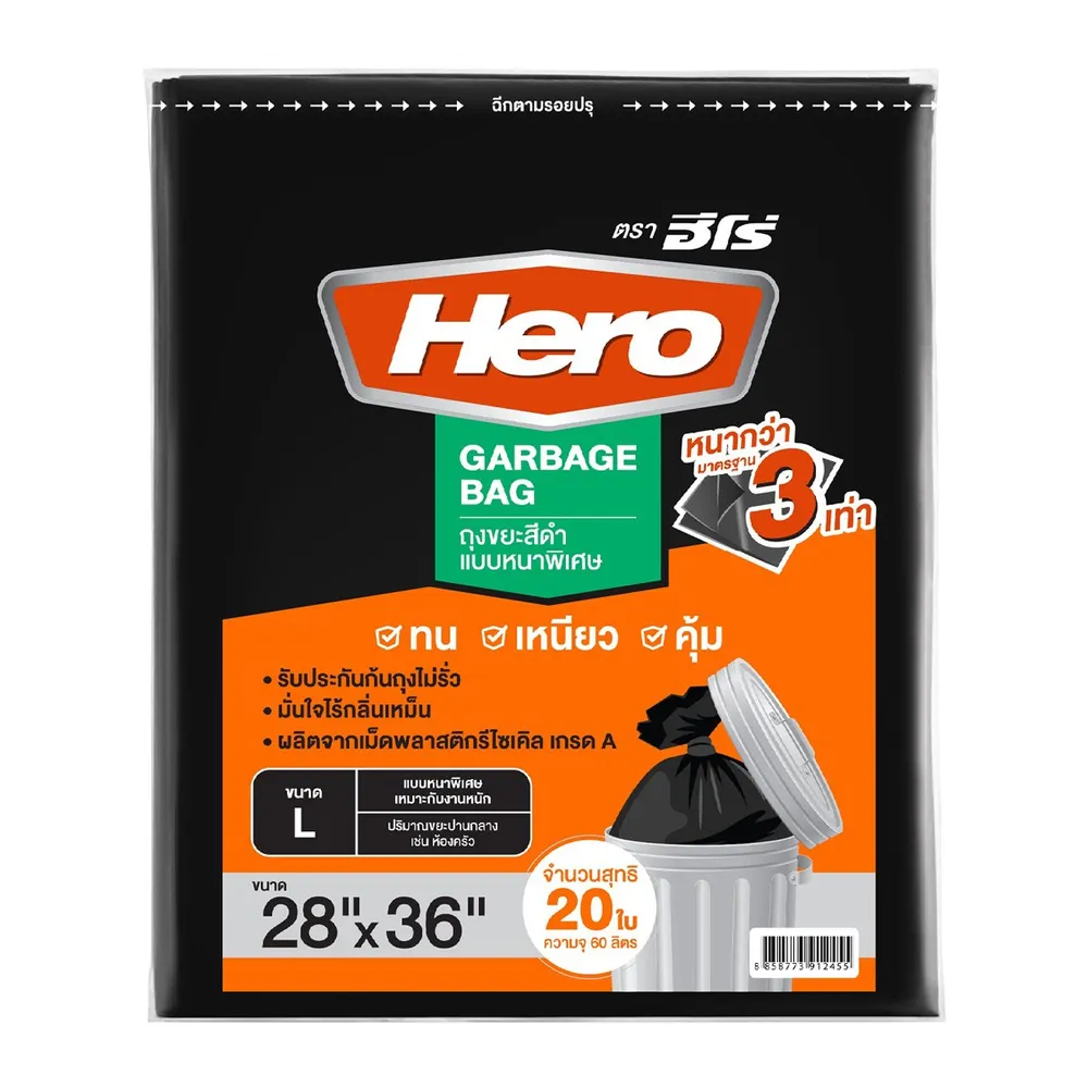 <p>ฮีโร่ ถุงขยะหนา 3 เท่า ขนาด 28 x 36 นิ้ว สีดำ 20 ใบ<br />