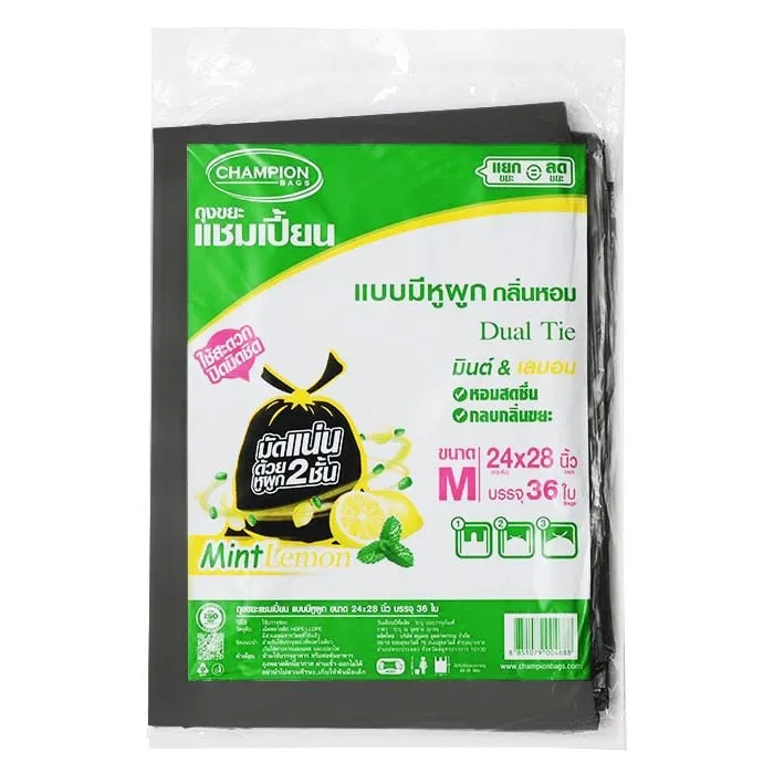 จัดเก็บขยะภายในบ้านได้อย่างมั่นใจเมื่อมีแชมเปี้ยน ถุงขยะแบบหูผูก กลิ่นมินต์ &amp; เลมอน ถุงขยะคุณภาพดีที่มาพร้อมหูผูก 2 ชั้น สำหรับปิดปากถุงให้มิดชิดป้องกันไม่ให้เศษขยะหล่นร่วงเลอะเทอะ และเพิ่มควยามสะดวกในการนำไปทิ้ง นอกจากนั้นถุงขยะยังมีกลิ่นมินต์ และเลมอน ให้ความหอมสดชื่น ช่วยลดกลิ่นขยะที่ไม่พึงประสงค์ได้อีกด้วย<br />