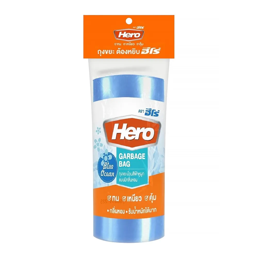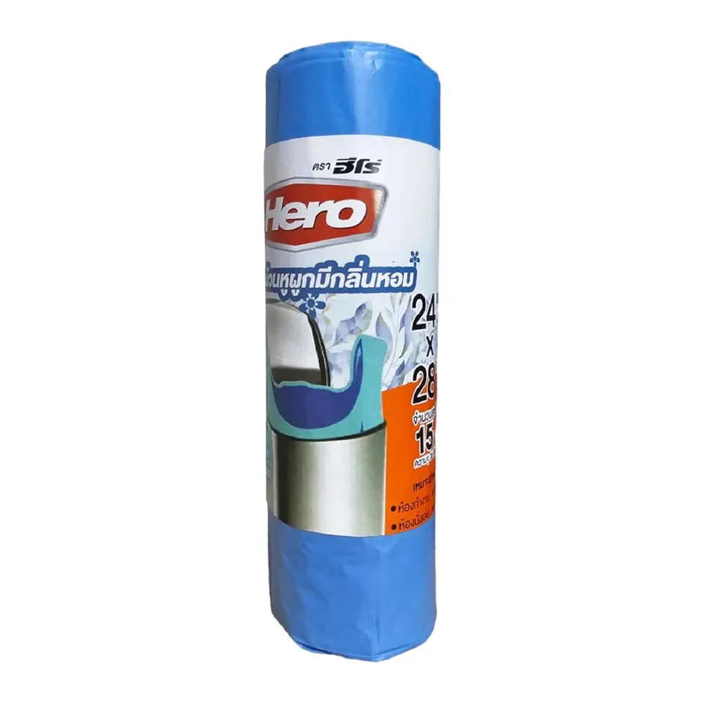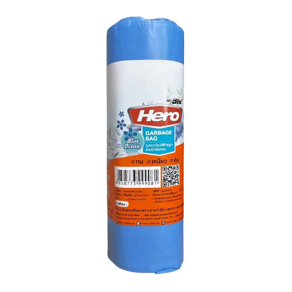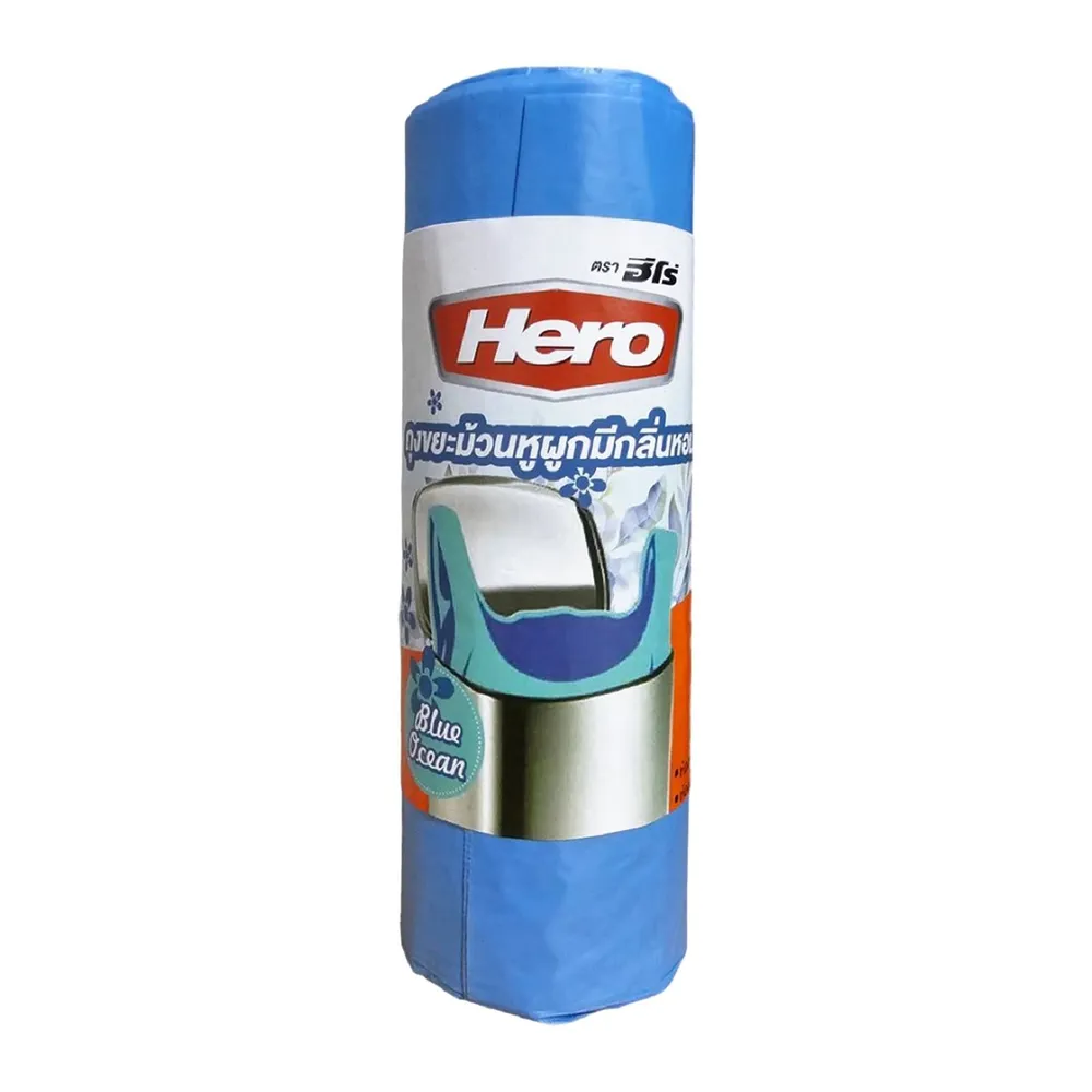 ฮีโร่ ถุงขยะม้วนหูผูก สีฟ้า กลิ่นบลูโอเชี่ยน ขนาด 24 x 28 นิ้ว 15 ใบ