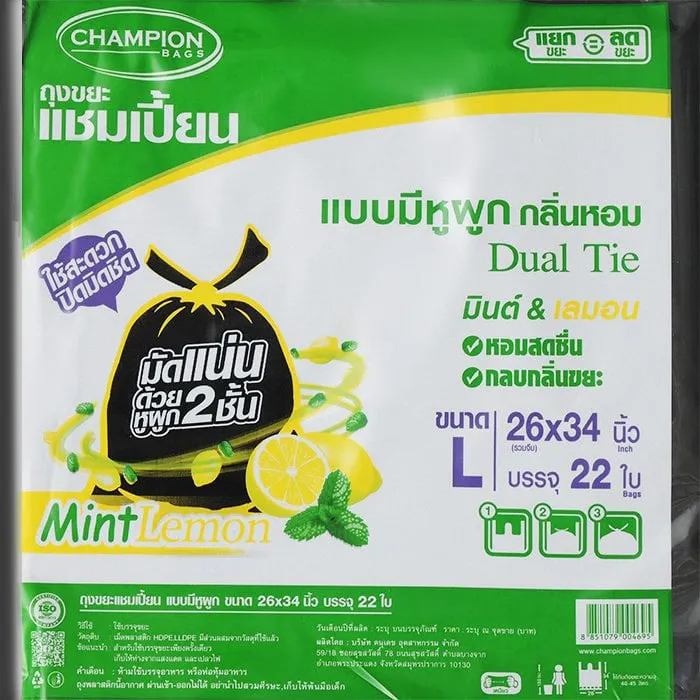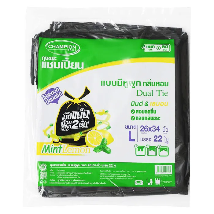 จัดเก็บขยะภายในบ้านได้อย่างมั่นใจเมื่อมีแชมเปี้ยน ถุงขยะแบบหูผูก กลิ่นมินต์ &amp; เลมอน ถุงขยะคุณภาพดีที่มาพร้อมหูผูก 2 ชั้น สำหรับปิดปากถุงให้มิดชิดป้องกันไม่ให้เศษขยะหล่นร่วงเลอะเทอะ และเพิ่มควยามสะดวกในการนำไปทิ้ง นอกจากนั้นถุงขยะยังมีกลิ่นมินต์ และเลมอน ให้ความหอมสดชื่น ช่วยลดกลิ่นขยะที่ไม่พึงประสงค์ได้อีกด้วย<br />